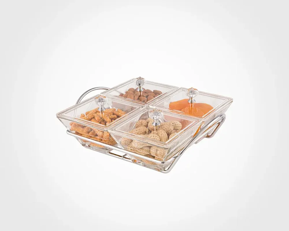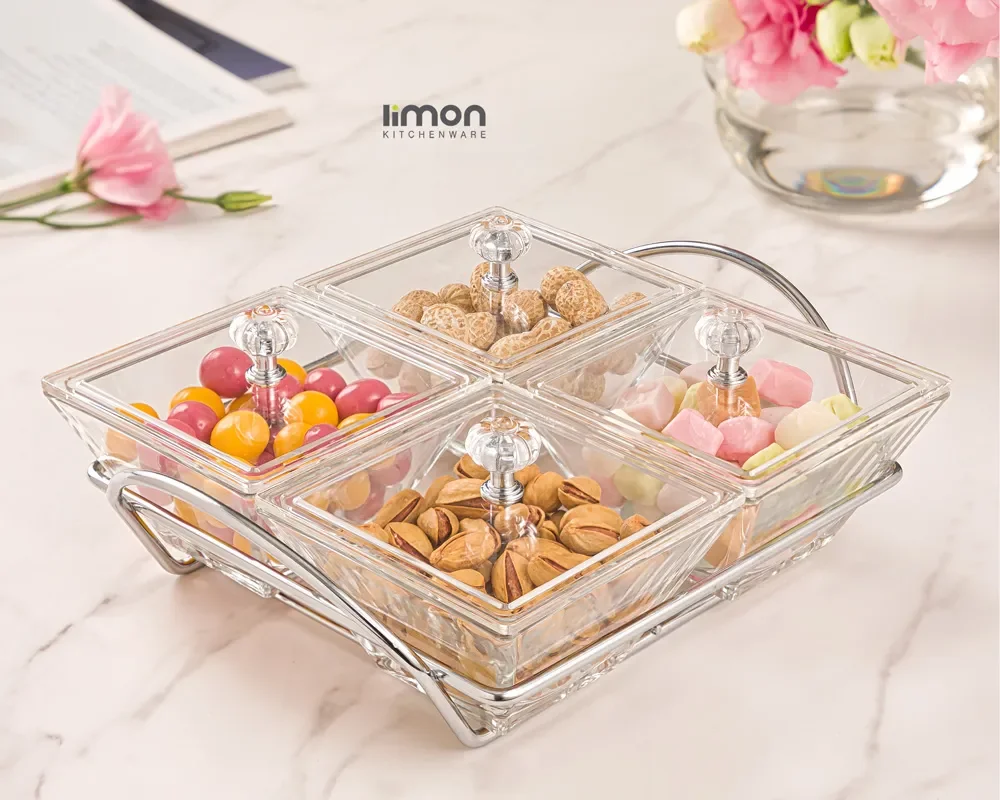 به دنیای شیک و مدرن سفر کنید با اردورخوری شیشهای مربع استنددار 4 خانه کد 2108. این محصول خاص با درب اکرولیک، ایدهآل برای مهمانیها و دورهمیهاست. طراحی منحصر بهفرد و کاربردی آن، جلوهای لوکس به میز شما میبخشد. به هر حال اگر دنبال ظروفی برای سرو آجیل، شکلات ،دسر ، تتقلات ترش و شیرین هستید، بدون شک اردوخوری شیشهای مربع 4 خانه دربدار لیمون یکی از بهترین گزینههای برای چیدمان میز سرو شما است.