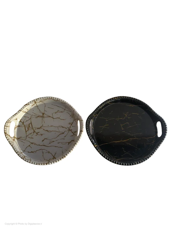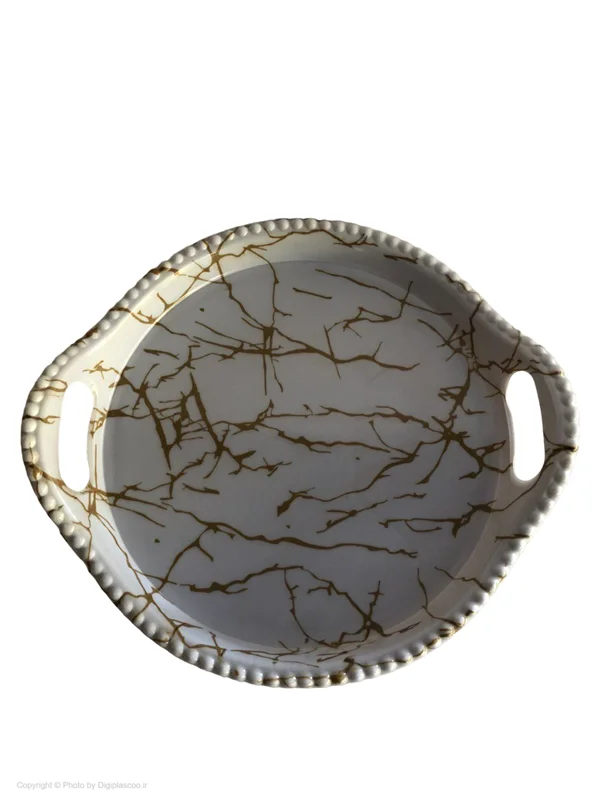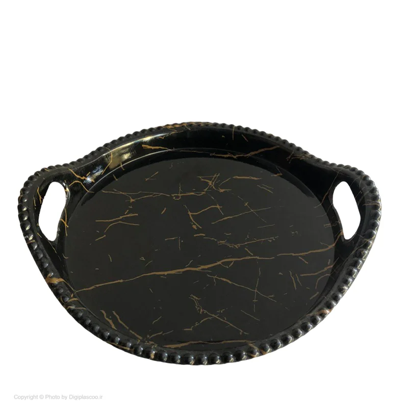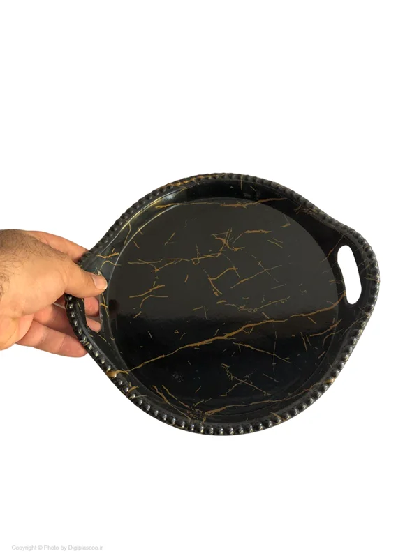 سینی گرد طرح سنگ مرمر با بدنه ای از جنس ملامین و در دو رنگ سفید و مشکی است، که برای پذیرایی از میهمانان مناسب می باشد. سایز این سینی کوچک با ابعاد طول: ۲۷.۵ عرض: ۲۵.۵ ارتفاع: ۵ سانتی متر و مناسب تا 4 نفر است.