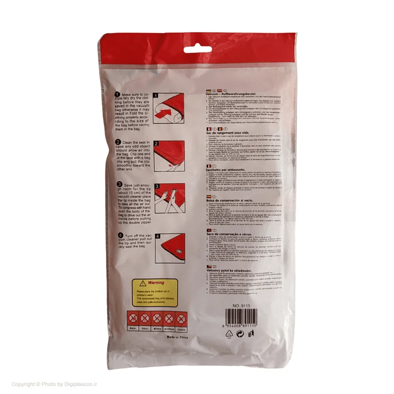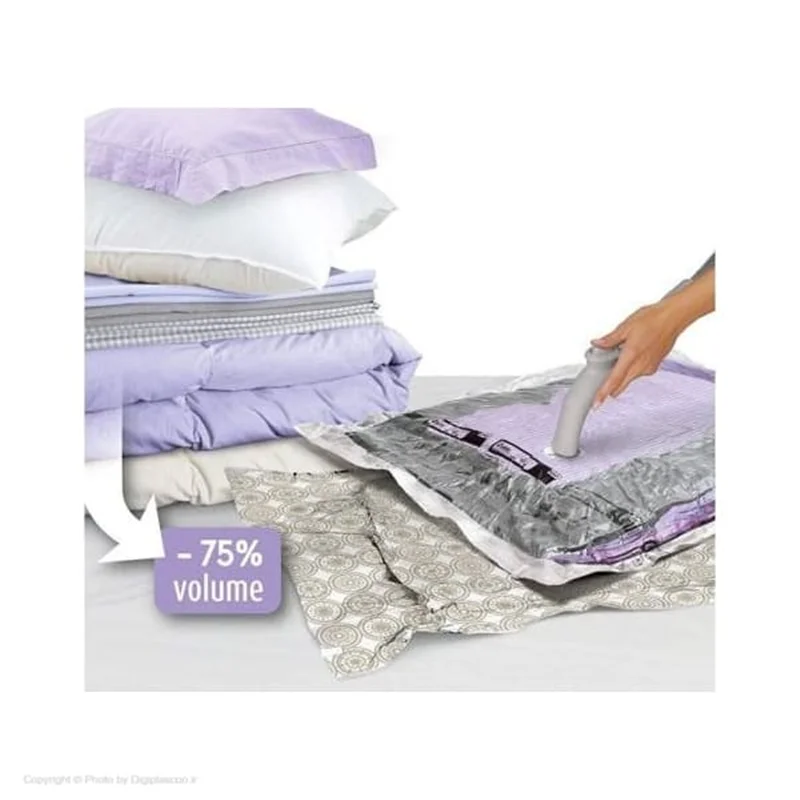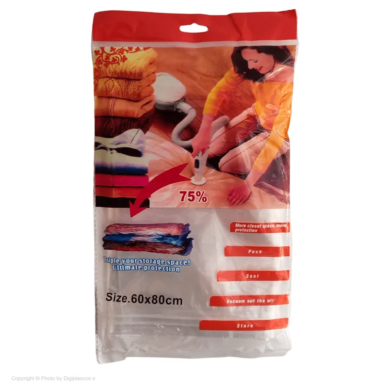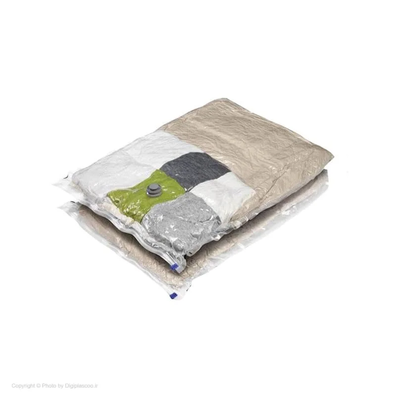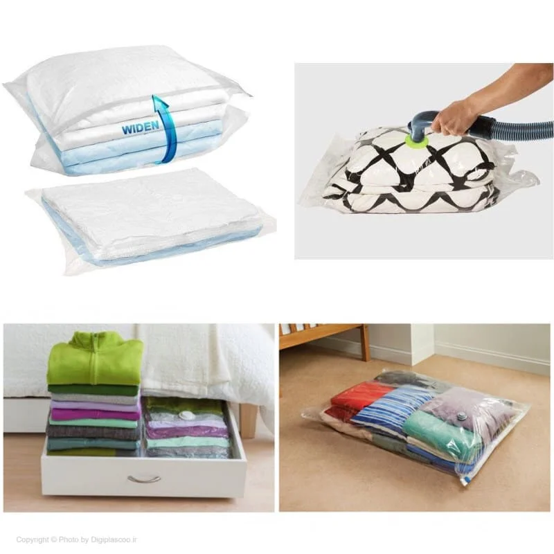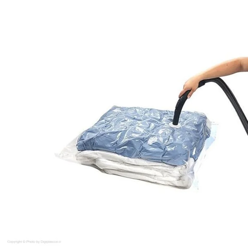 وکیوم پک کیسه مخصوصی است که شما میتوانید با استفاده از آن حجم البسه خود را تا 75% کاهش دهید. یکی از کاربردهای استفاده از کیسه کم حجم کننده لباس یا همان وکیوم بگ جلوگیری از نفوذ حشرات، بید زدگی، رطوبت، بوگرفتگی، گرد و خاک و نفوذ قارچ ها و باکتری ها به داخل البسه است. یا تصور کنید که قصد رفتن به سفر را دارید آیا دوست ندارید حجم لباس هایتان تا یک چهارم کاهش پیدا کند تا راحت تر در چمدان یا ساک شما جای بگیرد؟ کیسه کم حجم کننده لباس (وکیوم بگ) این کار را برای شما انجام می دهد. فقط کافیست از قسمت کناری کیسه پوشاک خود را وارد کیسه کرده و سپس بعد از بستن زیپ مخصوص با جاروبرقی اقدام به تخلیه هوای داخل کیسه نمایید. دقت کنید برای دریافت نتیجه مطلوب از تا کردن زیاد البسه داخل کیسه خودداری نمایید تا هوا بتواند در هنگام مکش به درستی خارج شود همچنین از فشردن زیاد البسه داخل یک کیسه خودداری نمایید. در هنگام تخلیه هوا حتما ابتدا جاروبرقی را خاموش کرده و سپس خرطومی جاروبرقی را از دهانه کیسه جدا کنید تا آسیبی به درب خروجی هوا وارد نشود.