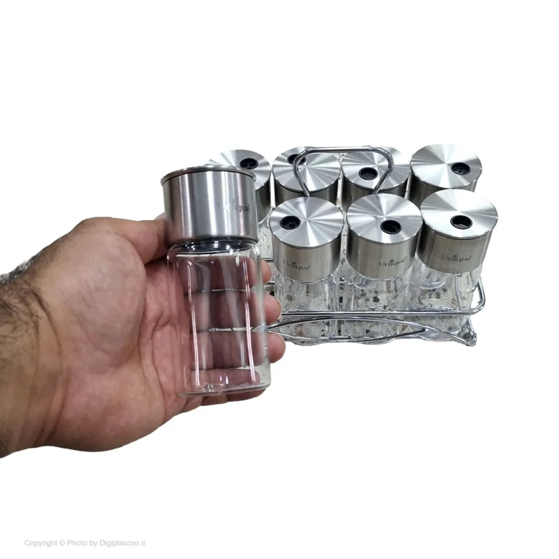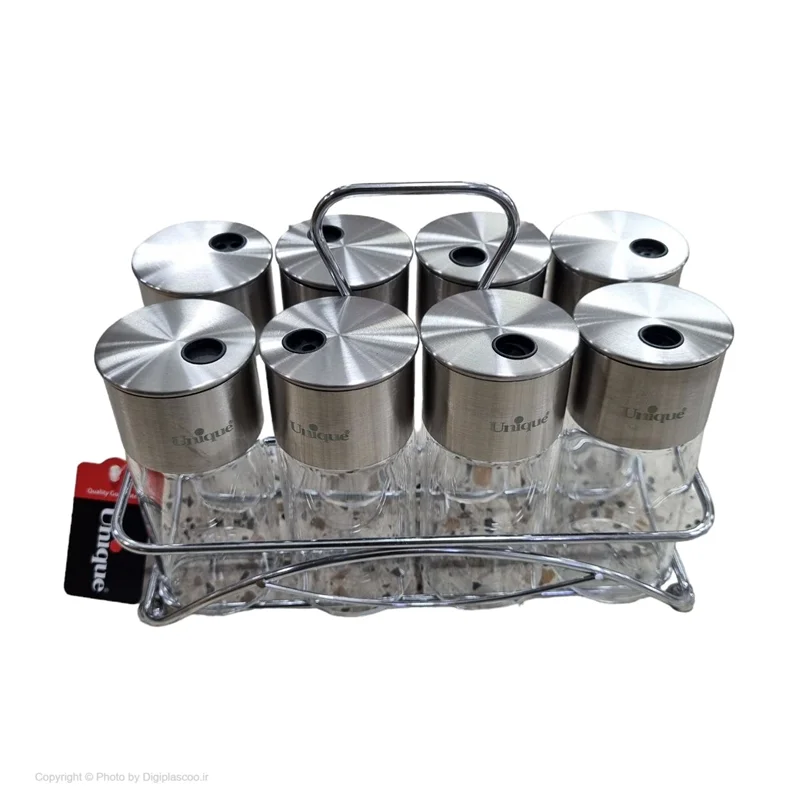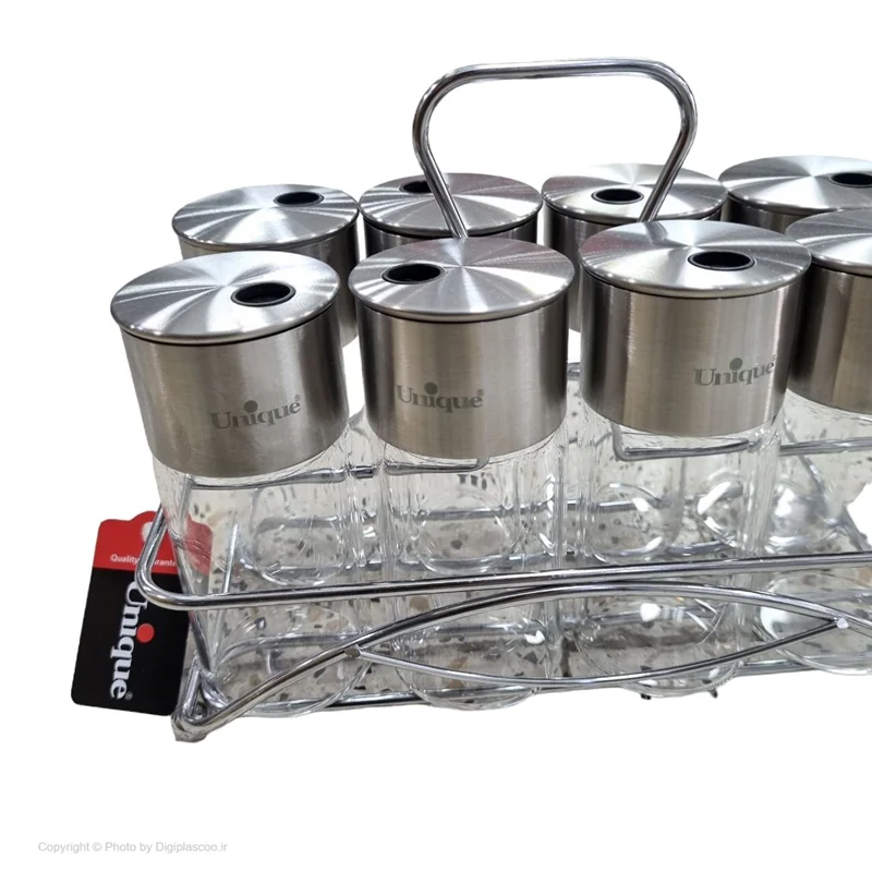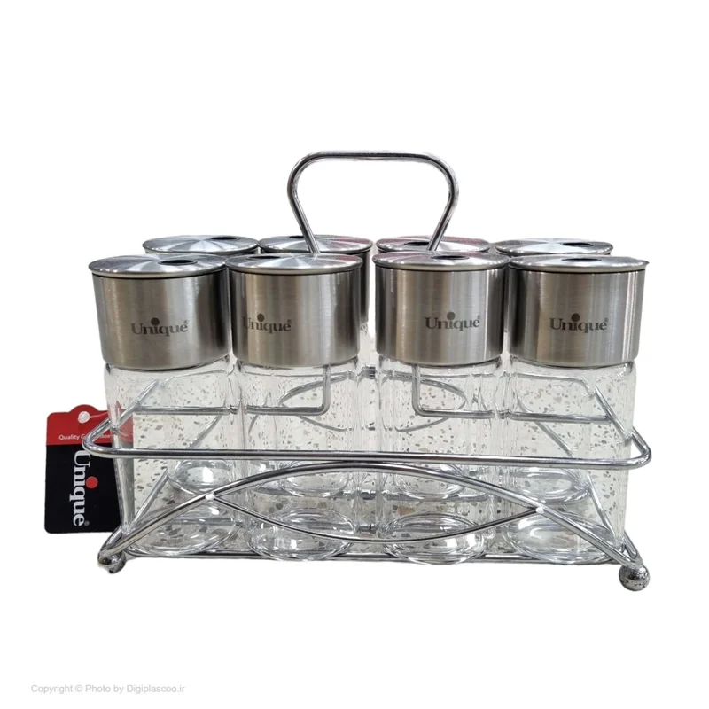ست جا ادویه مستطیل شکل یونیک شامل ۸ عدد ظرف ادویه به همراه استند استیل میباشد. قرارگیری ظروف ادویه داخل استند، کارایی و جابجایی محصول را برای فرد سادهتر میکند. ظروف جا ادویه یونیک از جنس شیشه شفاف و نشکن ساخته شده است. جنس استیل درب ظروف با استند استیل ضد زنگ، هارمونی شیک و جذابی را به وجود آورده است. مقاومت بالا، دوام و کیفیت قابل توجه از دیگر مشخصات اصلی ست جا ادویهای استیل یونیک محسوب میشود.