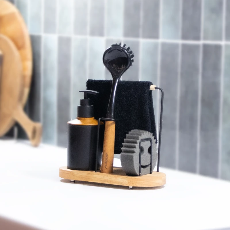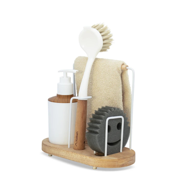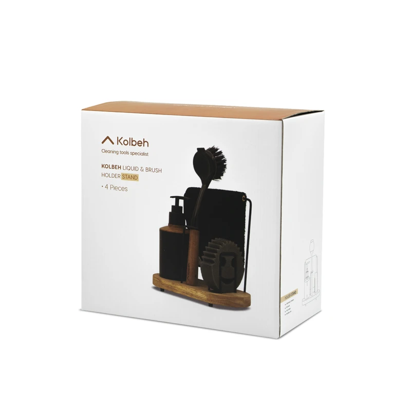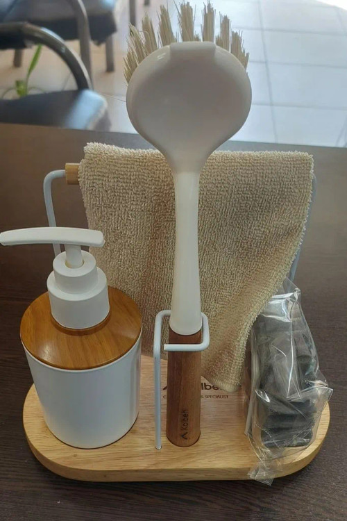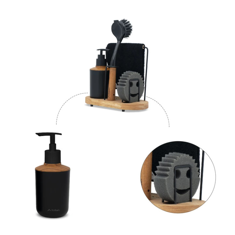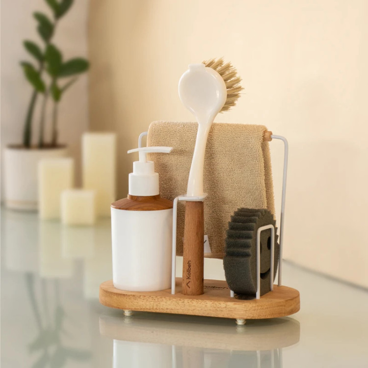 مخزن مایع ظرفشویی کلبه مدل استند دار به همراه فرچه، اسکاچ و دستمال نظافت