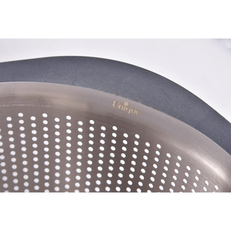 ▪️ طراحی پانچی مدرن: دارای سوراخهای پانچی دقیق و یکنواخت که علاوه بر تخلیه سریع آب، از آسیب به بافت مواد غذایی (مانند برنج پخته) جلوگیری میکند.
