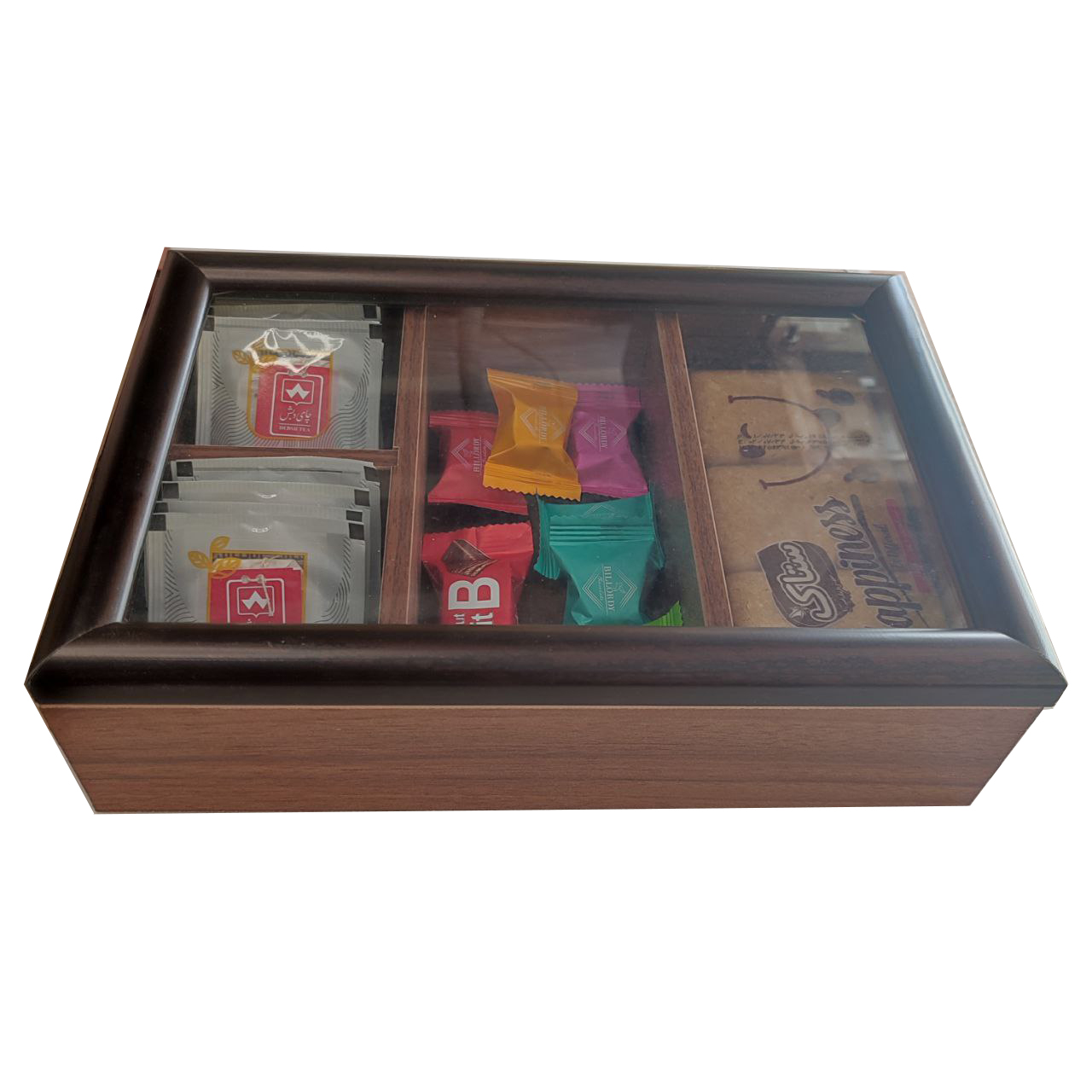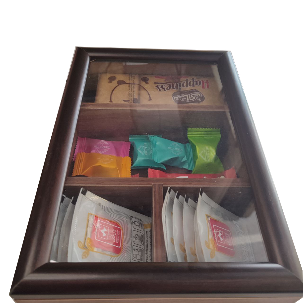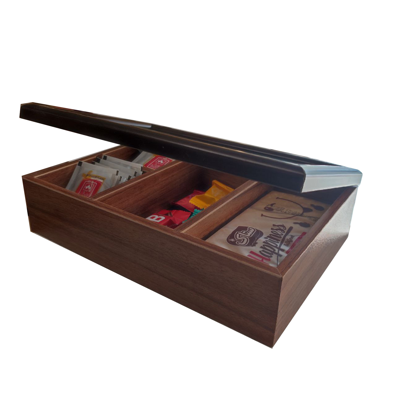 تی بگ 4 خانه یا یک جعبه پذیرایی تی بگ 4 خانه می باشد که از روکش چوب ام دی اف با درب شیشه ای ساخته شده است. جعبه تی بگ مناسب برای نگهداری انواع نسکافه، چای، دم نوش، شکلات و سایر تنقلات می باشد که هنگام پذیرایی در مهمانی یا ادارات می توان از آن ها استفاده کرد. جعبه چوبی تی بگ 4 خانه به دلیل تنوع در ساخت و طرح را می توان به عنوان یک وسیله ی دکوری در محیط خانه یا محل کار استفاده نمود و حتی می توان به عنوان هدیه برای تاثیر گذاری در مخاطب استفاده شود.