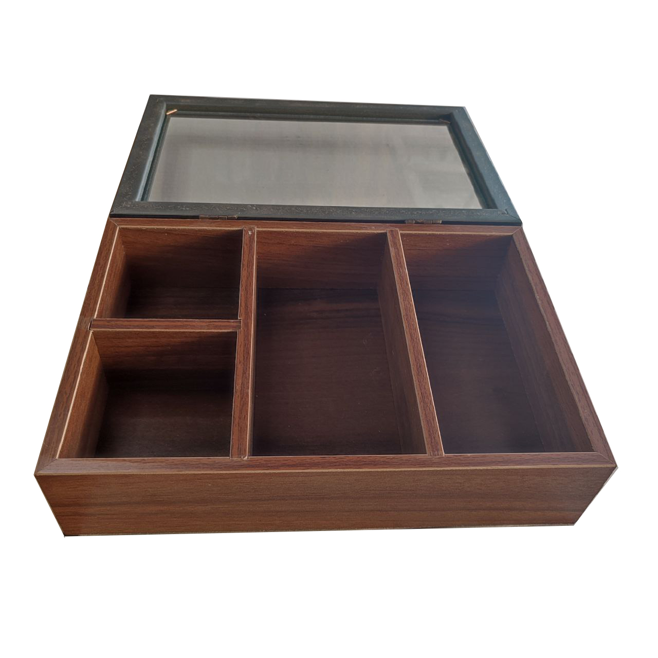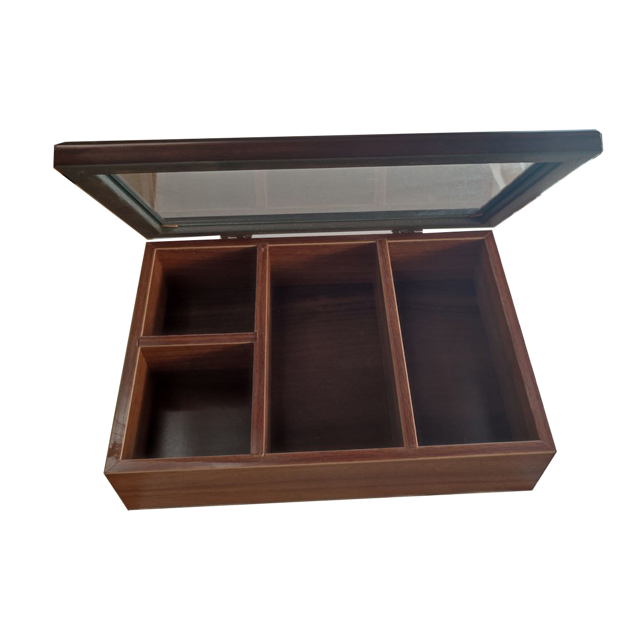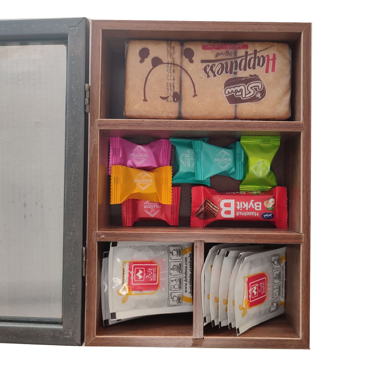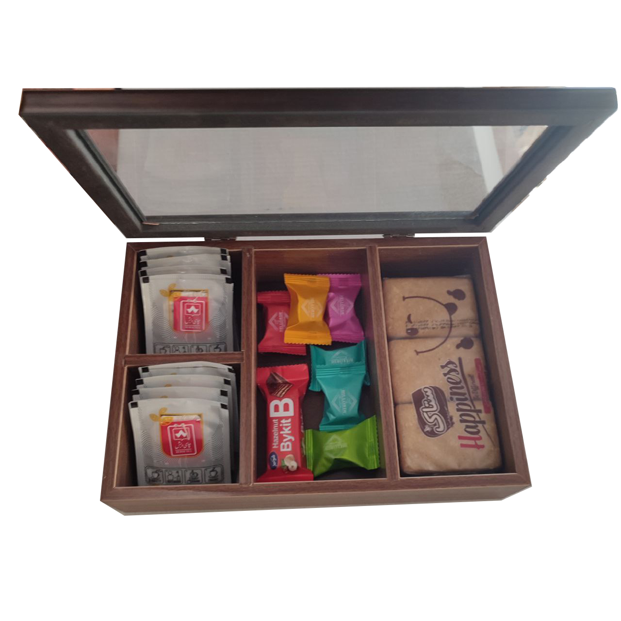 تی بگ 4 خانه یا یک جعبه پذیرایی تی بگ 4 خانه می باشد که از روکش چوب ام دی اف با درب شیشه ای ساخته شده است. جعبه تی بگ مناسب برای نگهداری انواع نسکافه، چای، دم نوش، شکلات و سایر تنقلات می باشد که هنگام پذیرایی در مهمانی یا ادارات می توان از آن ها استفاده کرد. جعبه چوبی تی بگ 4 خانه به دلیل تنوع در ساخت و طرح را می توان به عنوان یک وسیله ی دکوری در محیط خانه یا محل کار استفاده نمود و حتی می توان به عنوان هدیه برای تاثیر گذاری در مخاطب استفاده شود.