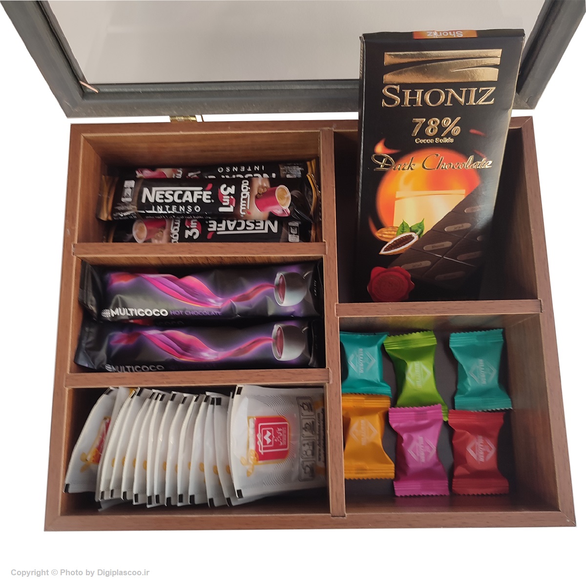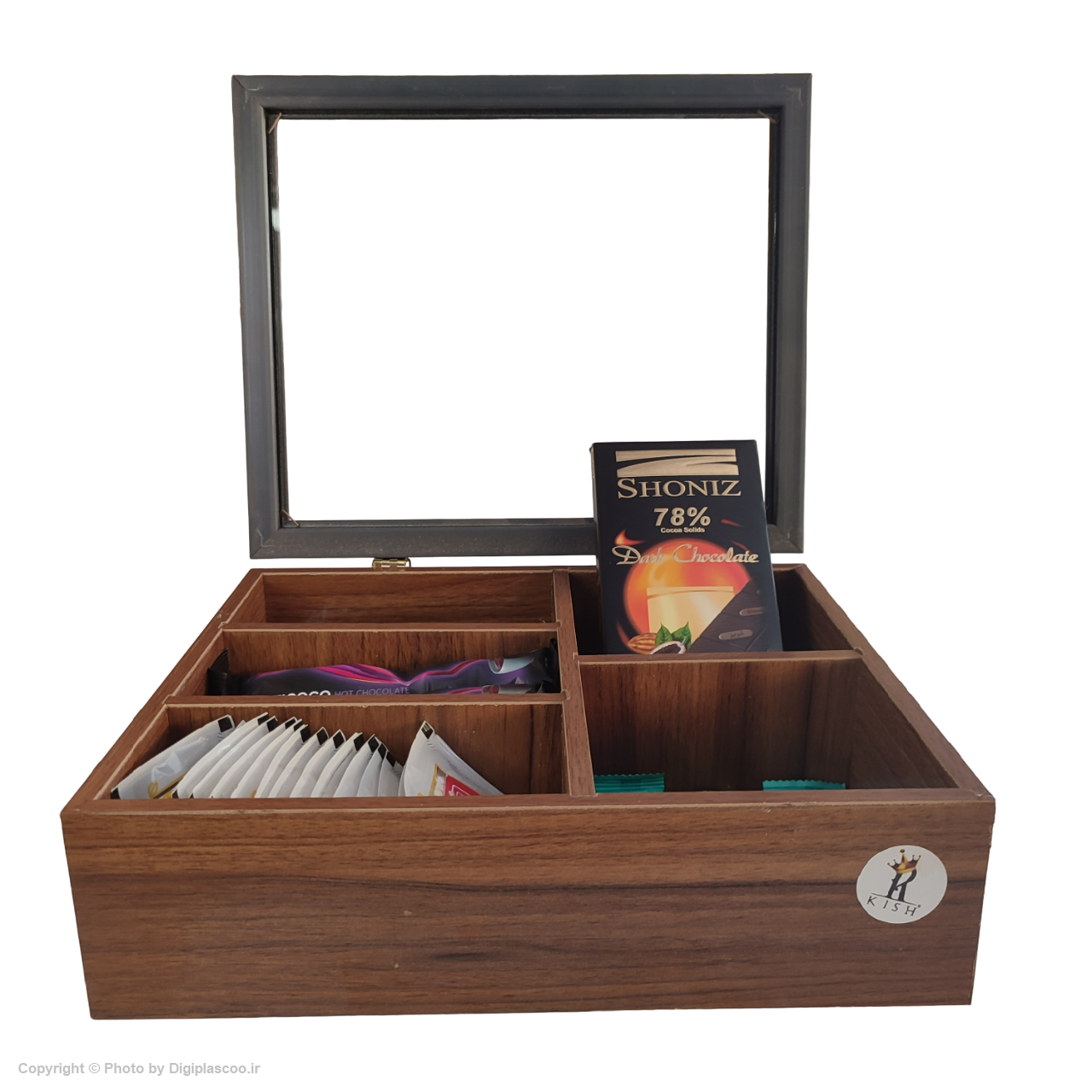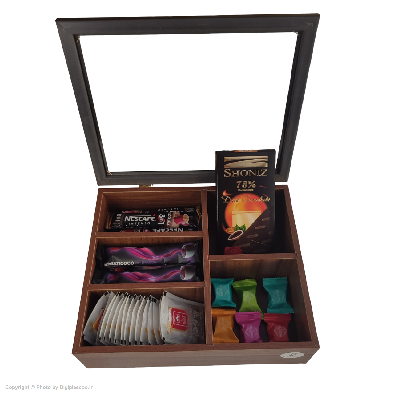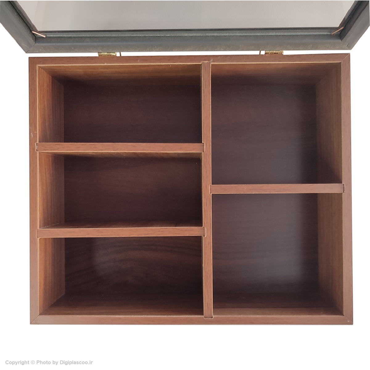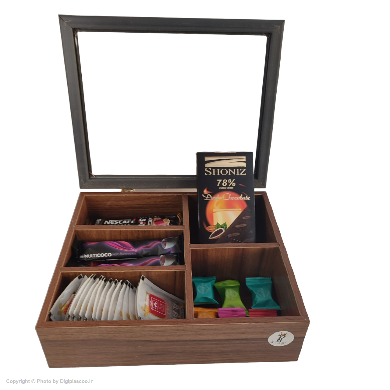تی بگ 5 خانه یا یک جعبه پذیرایی تی بگ 5 خانه می باشد که از روکش چوب ام دی اف با درب شیشه ای ساخته شده است. جعبه تی بگ مناسب برای نگهداری انواع نسکافه، چای، دم نوش، شکلات و سایر تنقلات می باشد که هنگام پذیرایی در مهمانی یا ادارات می توان از آن ها استفاده کرد. جعبه چوبی تی بگ 5 خانه به دلیل تنوع در ساخت و طرح را می توان به عنوان یک وسیله ی دکوری در محیط خانه یا محل کار استفاده نمود و حتی می توان به عنوان هدیه برای تاثیر گذاری در مخاطب استفاده شود.