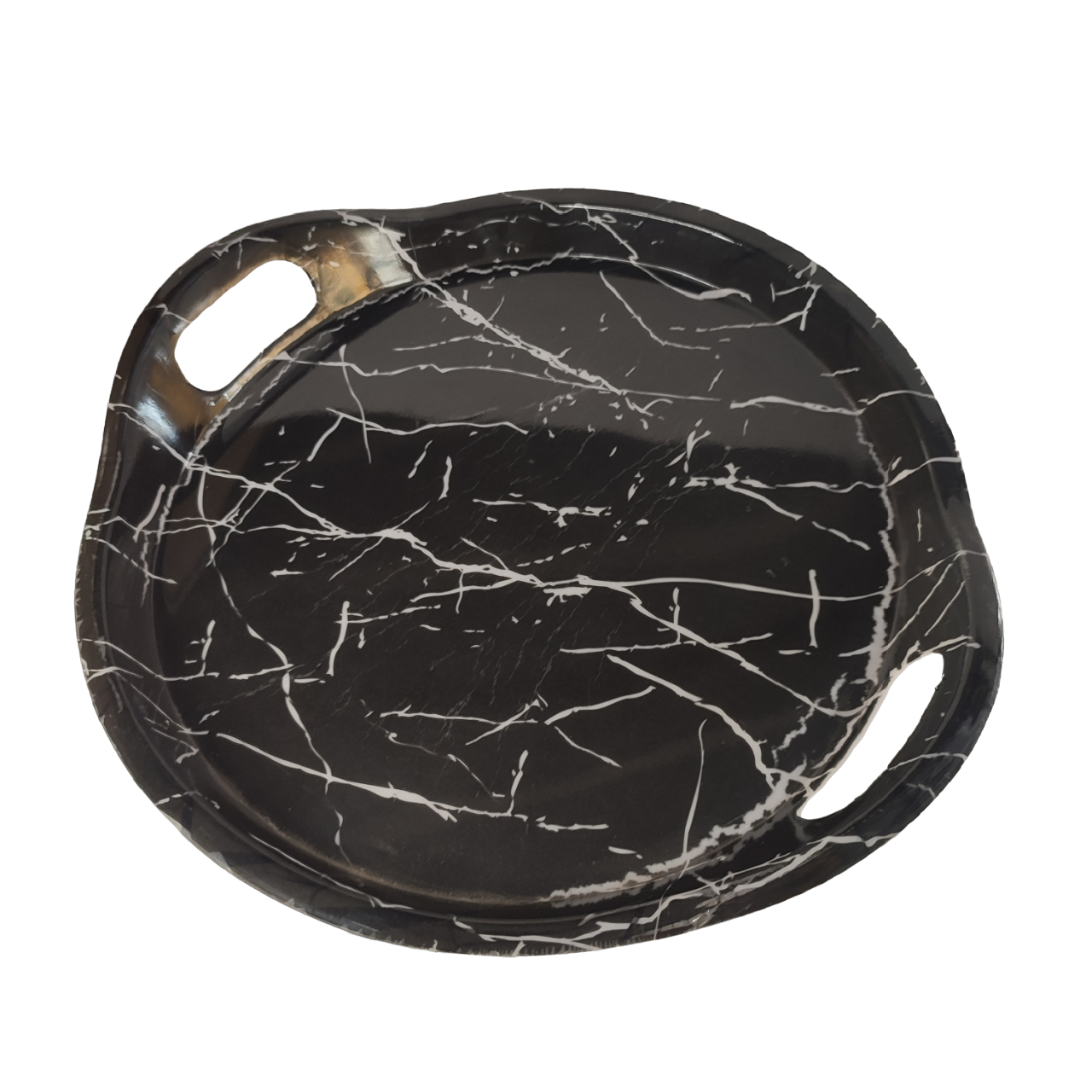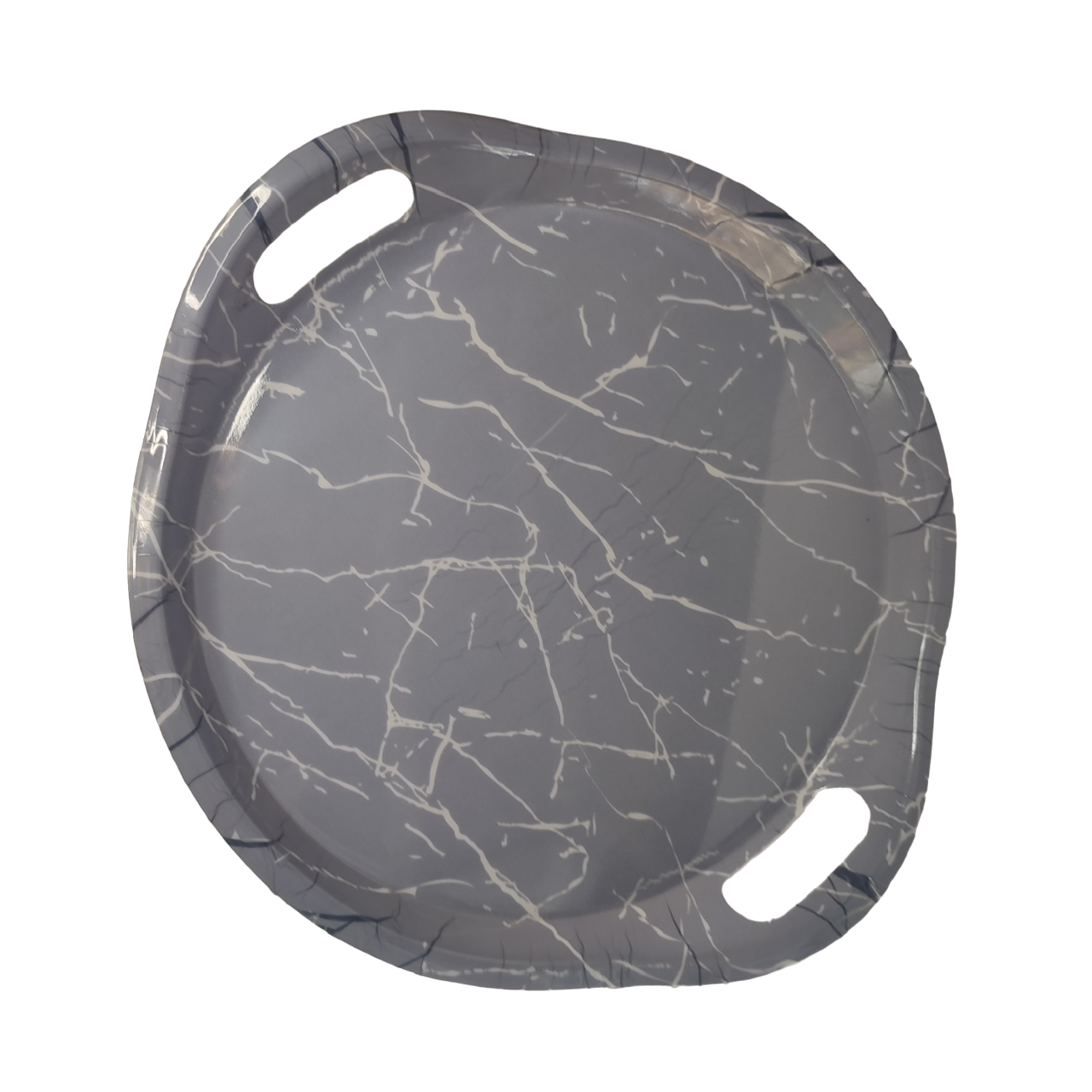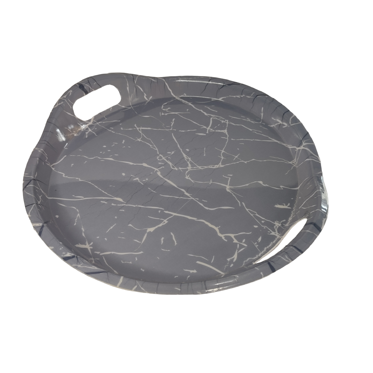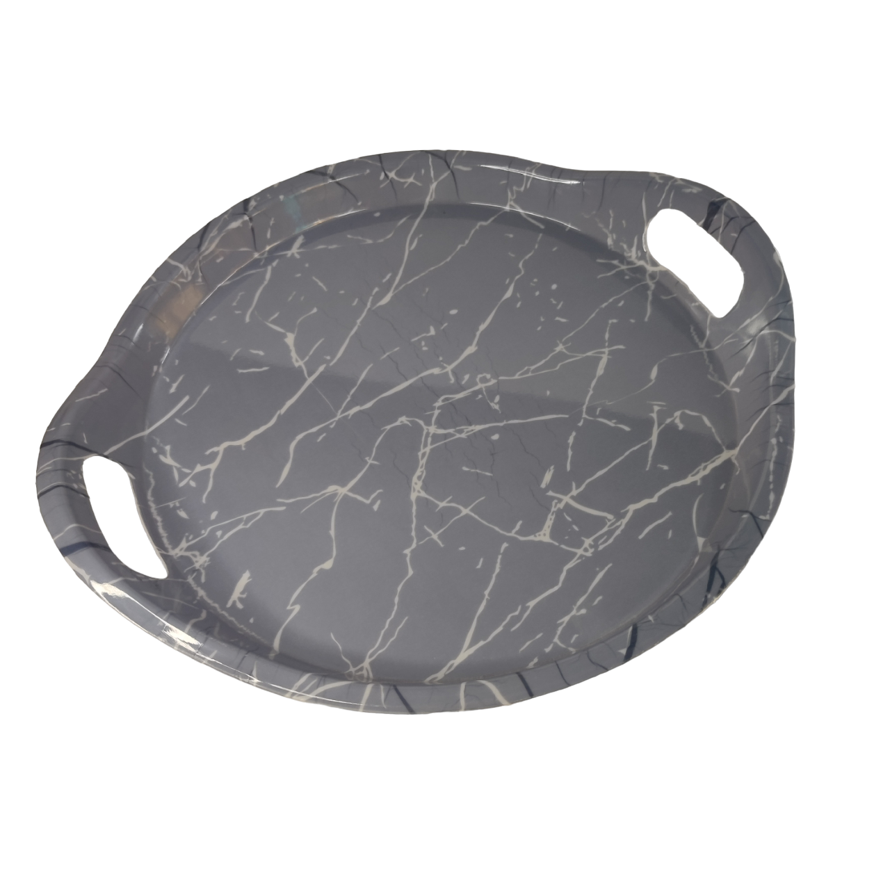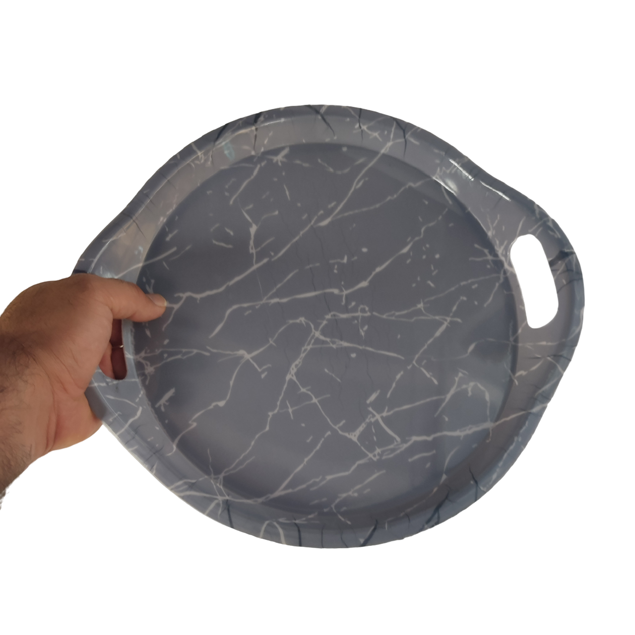 سینی گرد طرح سنگ مرمر با بدنه ای از جنس Pvc (پلاستیک سخت یا ملامینی) و در سه رنگ سفید، مشکی و طوسی تولید شده که برای پذیرایی از میهمانان مناسب می باشد.