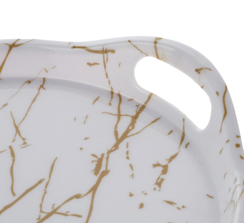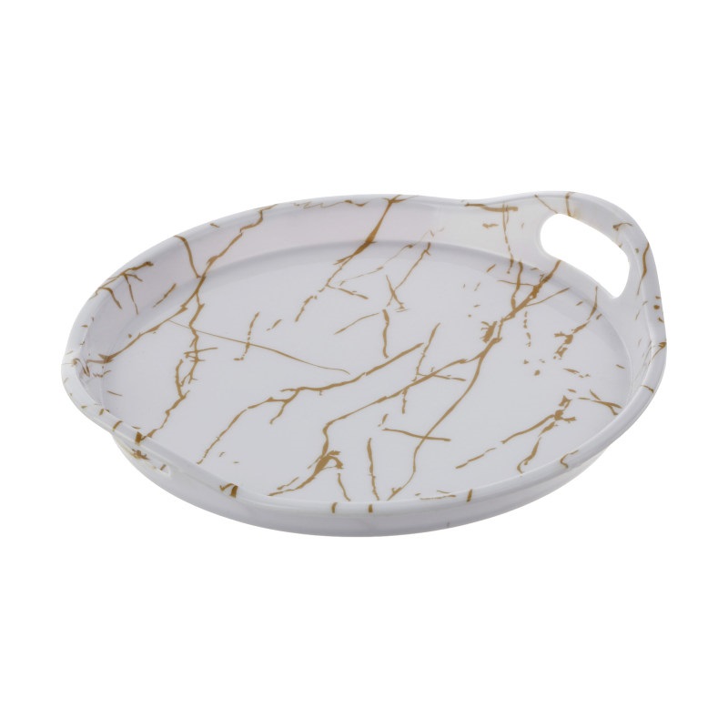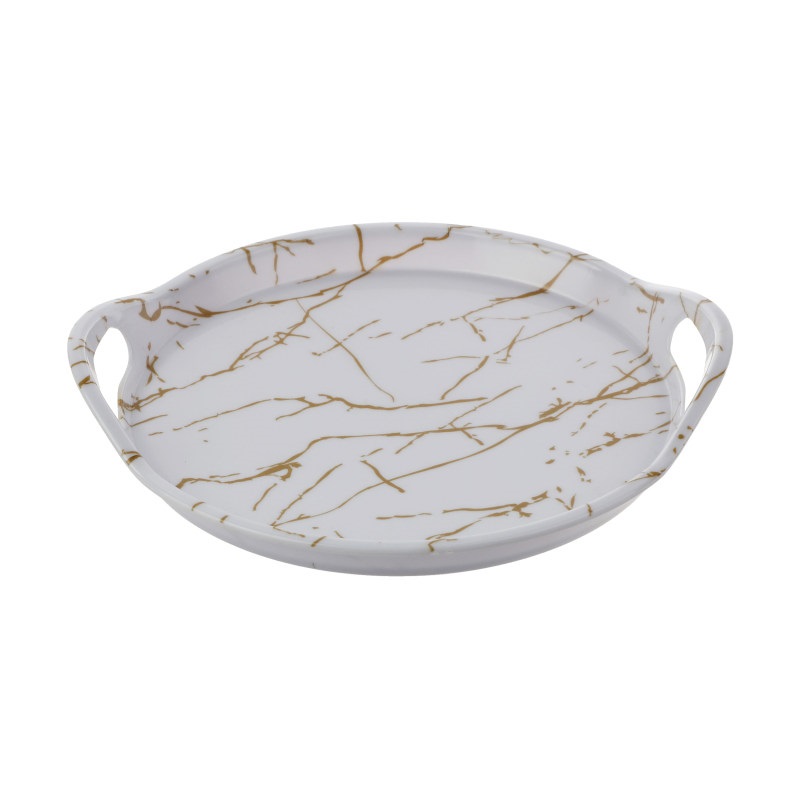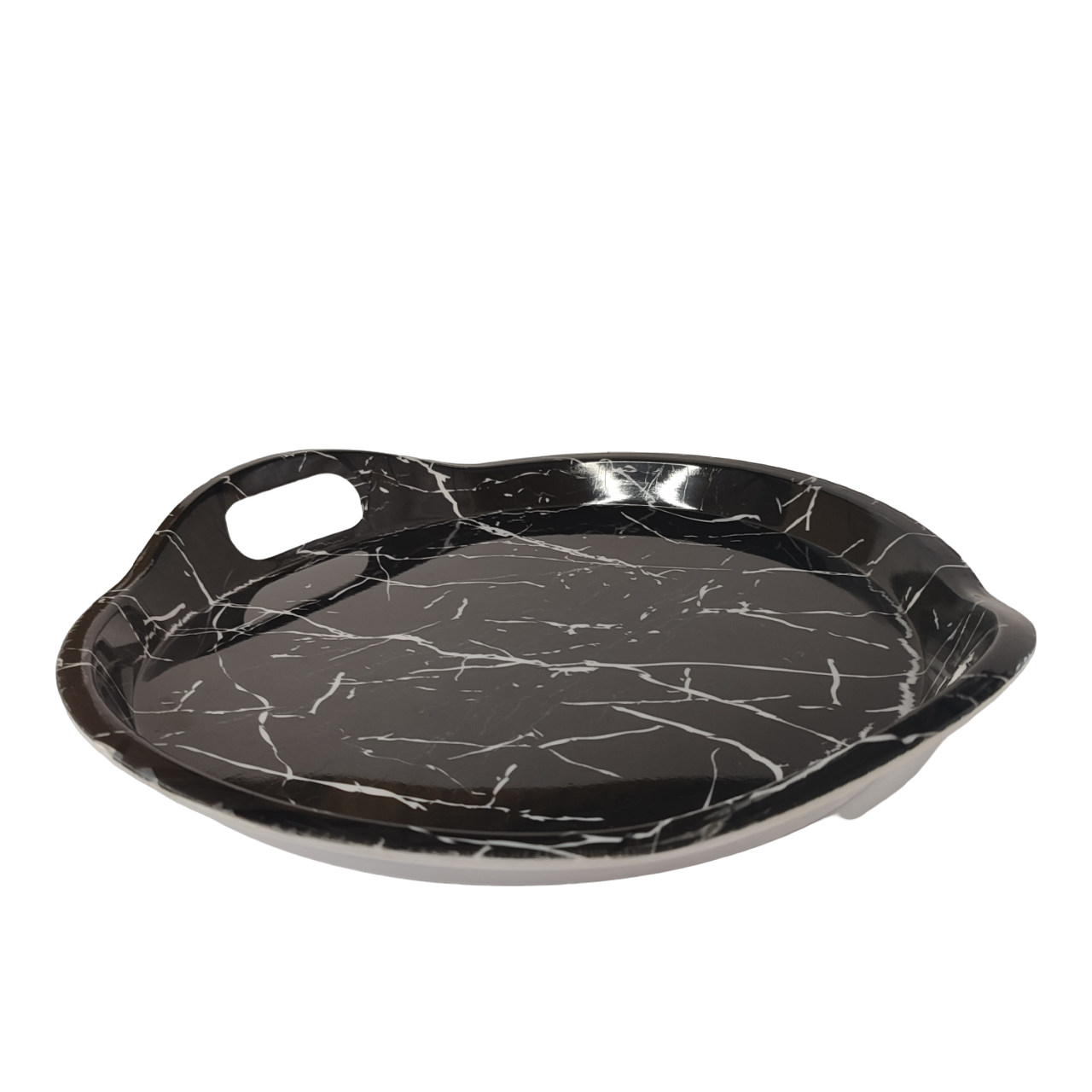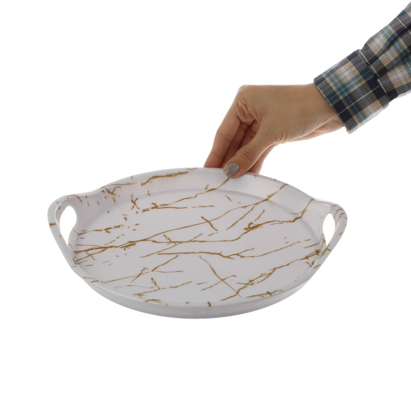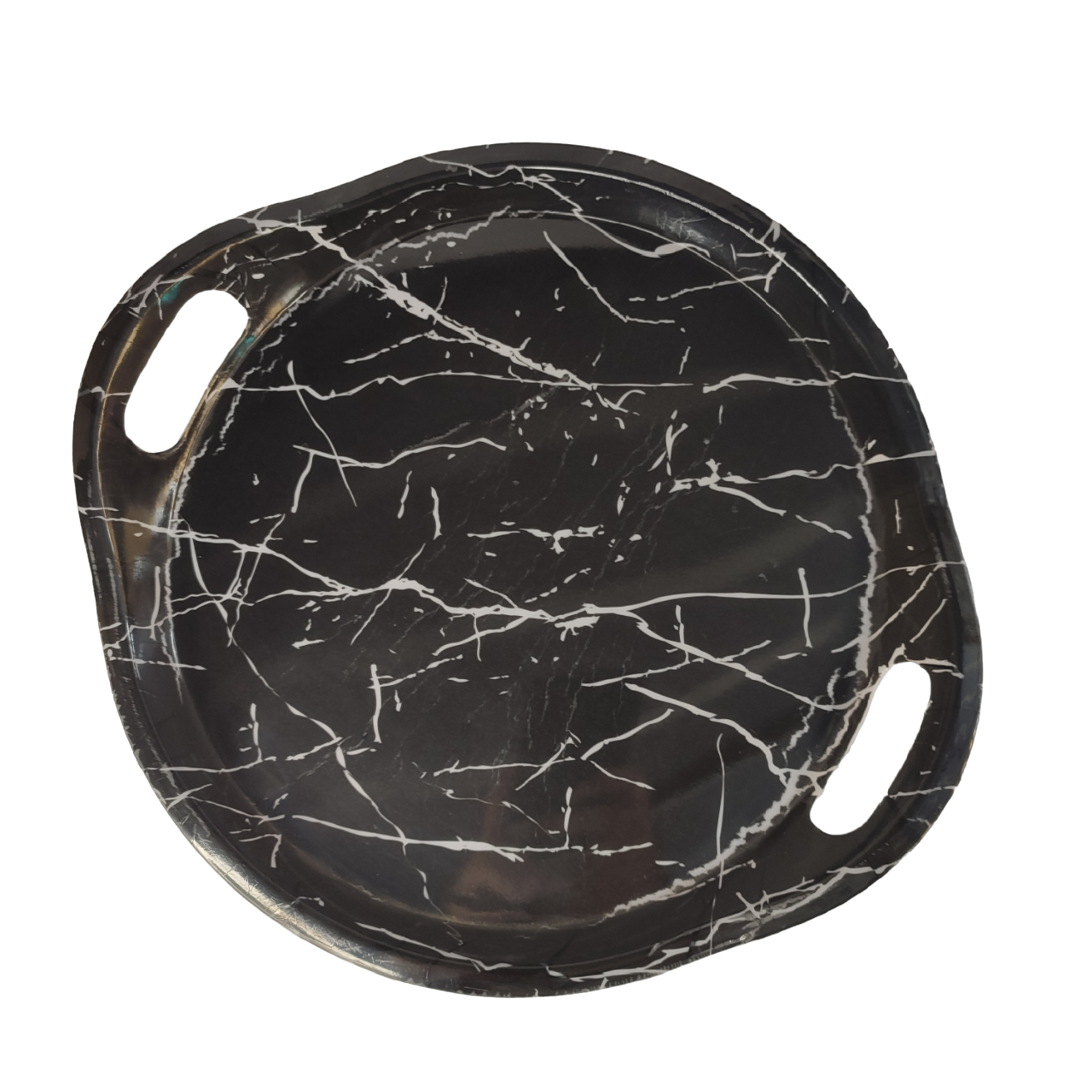 سینی گرد طرح سنگ مرمر با بدنه ای از جنس Pvc (پلاستیک سخت یا ملامینی) و در سه رنگ سفید، مشکی و طوسی تولید شده که برای پذیرایی از میهمانان مناسب می باشد.