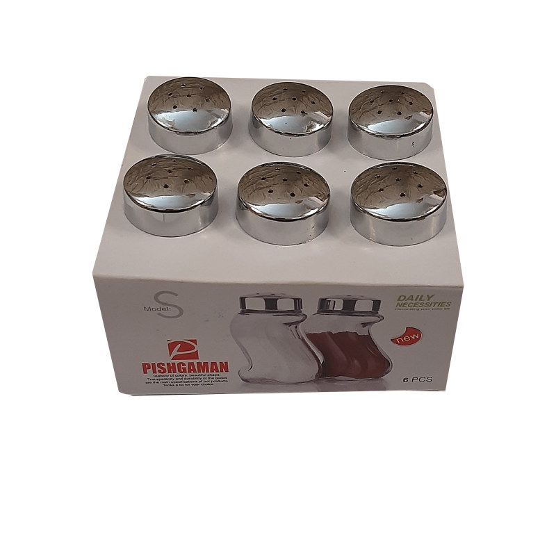 نمکدان پیشگامان مدل اس با طراحی زیبا و خوش دست است. این ست محصول نسبت به محصولات مشابه کوچک و خوش دست و بد فرم به نظر نمی رسد. جنس این محصول بلور است و سری آن نیز پیچی است و پلاستیک فشرده شده آبکاری شده است. ارتفاع این محصول اندازه انگشت سبابه معمولی است و سوراخ های تعبیه شده برای ریختن نمک بزرگ نیست که نمک و فلفل به مقدار زیاد ریخته شود بلکه به اندازه استاندارد خروجی می دهد.