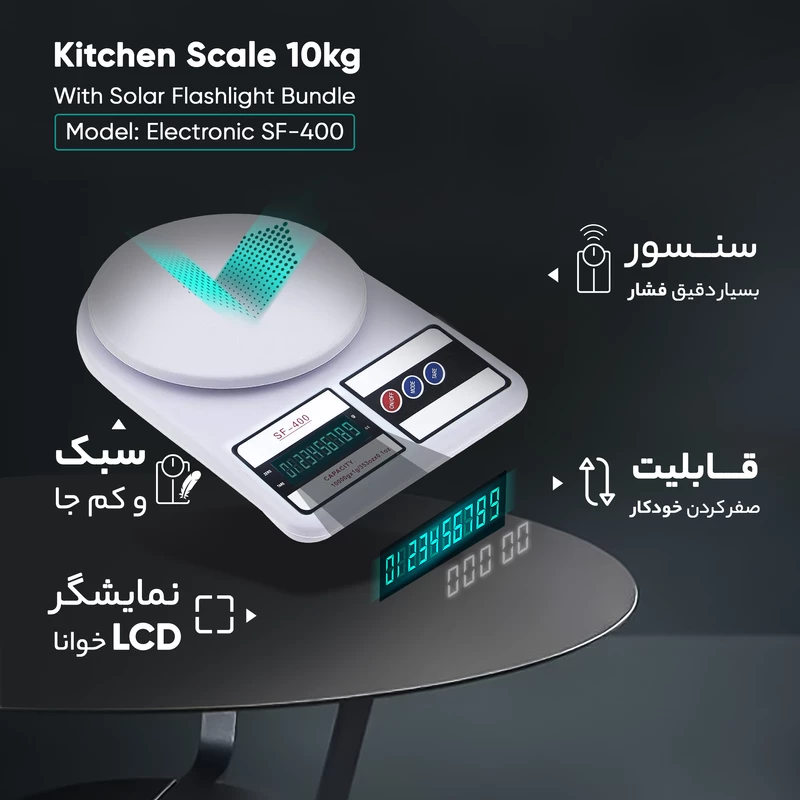 برای پختن انواع غذاها، شیرینی، کیک و … به ترکیب مقدار معینی از مواد نیاز است. علاوه بر این برای دانستن وزن برخی کالاها و مواد غذایی یک ترازوی دیجیتالی خوب با دقت بالا در آشپزخانه می تواند به شما کمک بزرگی کند. ترازو دیجیتال آشپزخانه مدل sf-400 دستگاهی فوق العاده دقیق و سبک با قابلیت اندازه گیری ۱ گرم تا ۱۰ کیلوگرم را دارا می باشد. این ترازوی آشپزخانه قابلیت صفر شدن اتوماتيک و خاموش شدن اتوماتيک را دارا می باشد. در صورتی که مدت کوتاهی بدون استفاده باشد، به طور خودکار خاموش می گردد تا انرژی کمتری را مصرف کند و عمر طولانی تر داشته باشد . ترازوی دیجیتالی آشپزخانه sf 400 توسط دو عدد باتری قلمی 1.5 ولتی کار می کند.