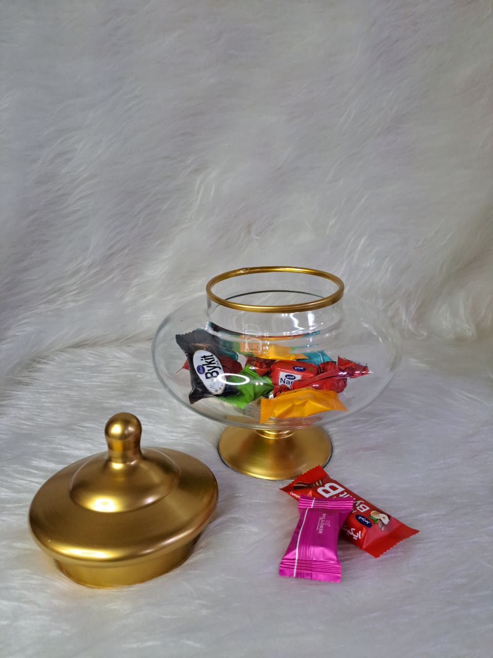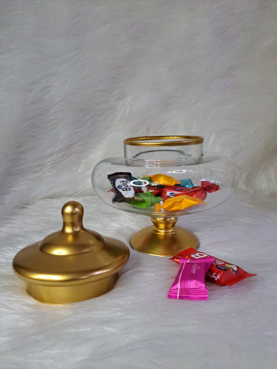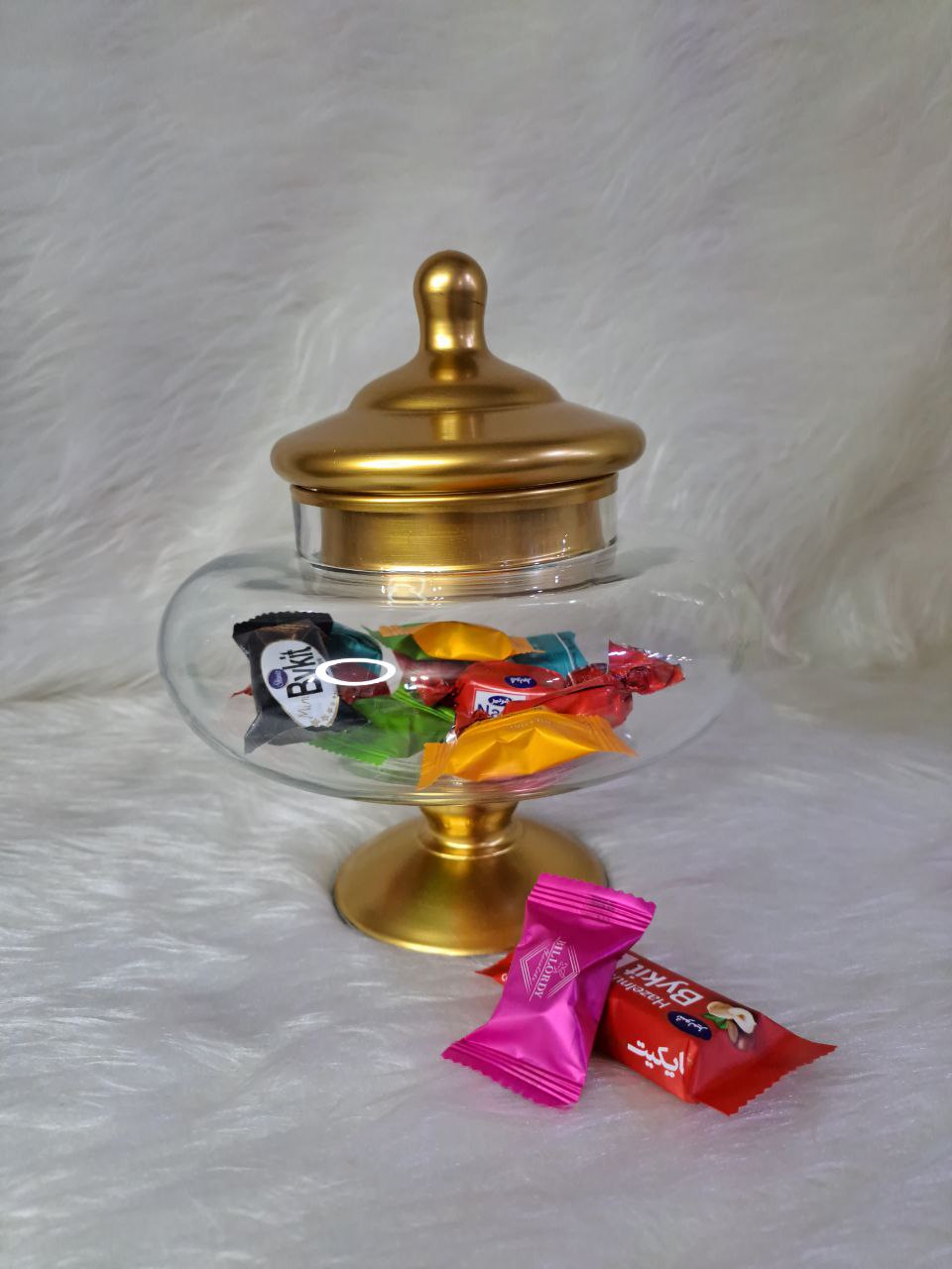 شکلات خوری مدل دورنگ طلایی با کد ۱۵۰۰۸ یک محصول زیبا و شیک جهت پذیرایی از مهمانان شما می باشد. ارتفاع این شکلات خوری 23 سانتی متر و پهنای کف پایه 10 سانتی متر و قطر درب آن 12.5 سانتی متر می باشد. جنس بدنه این محصول از شیشه و قسمت اتصال بالا و پایین از جنس آنتیک می باشد.