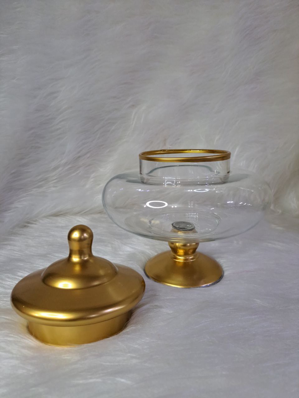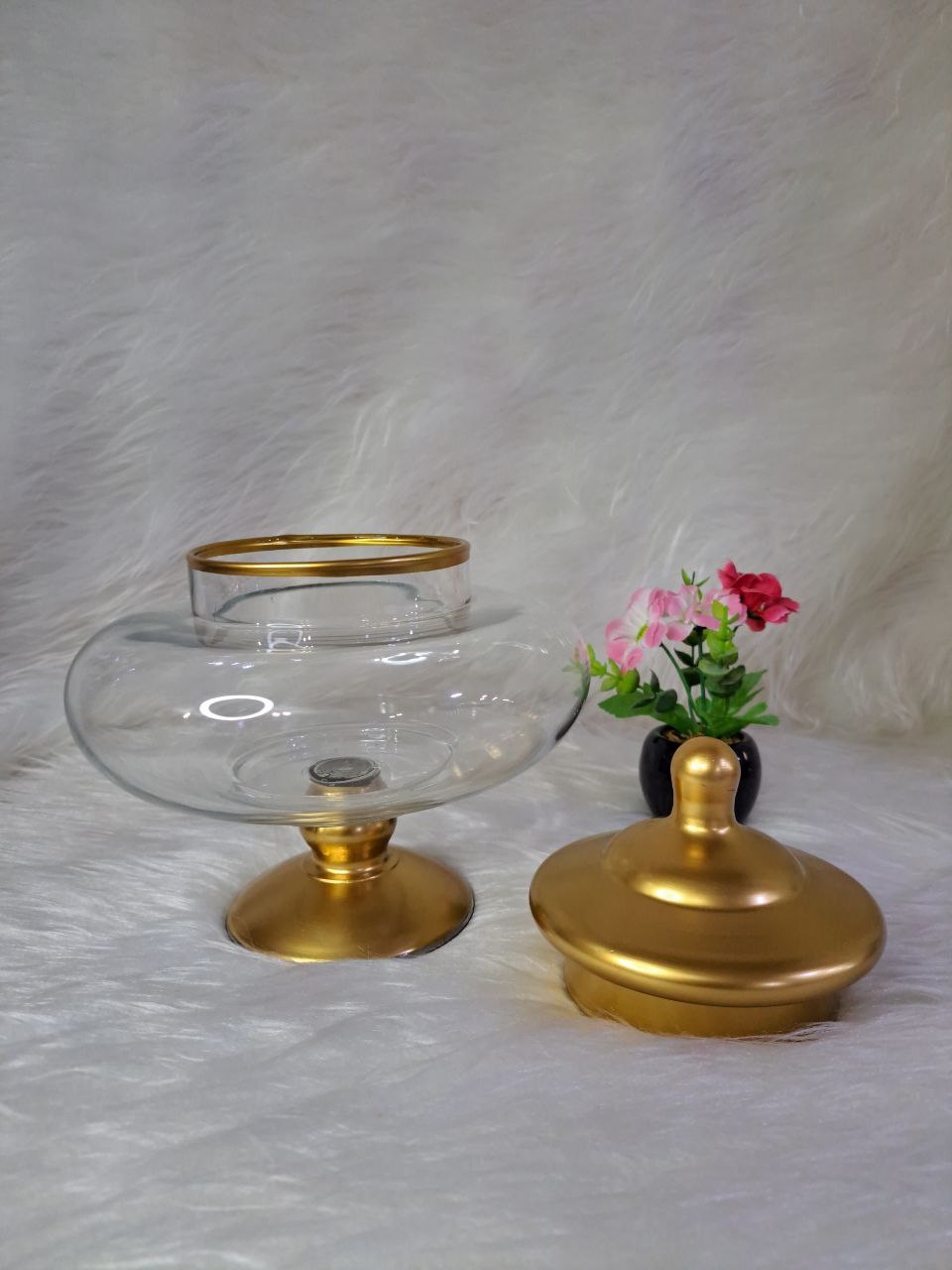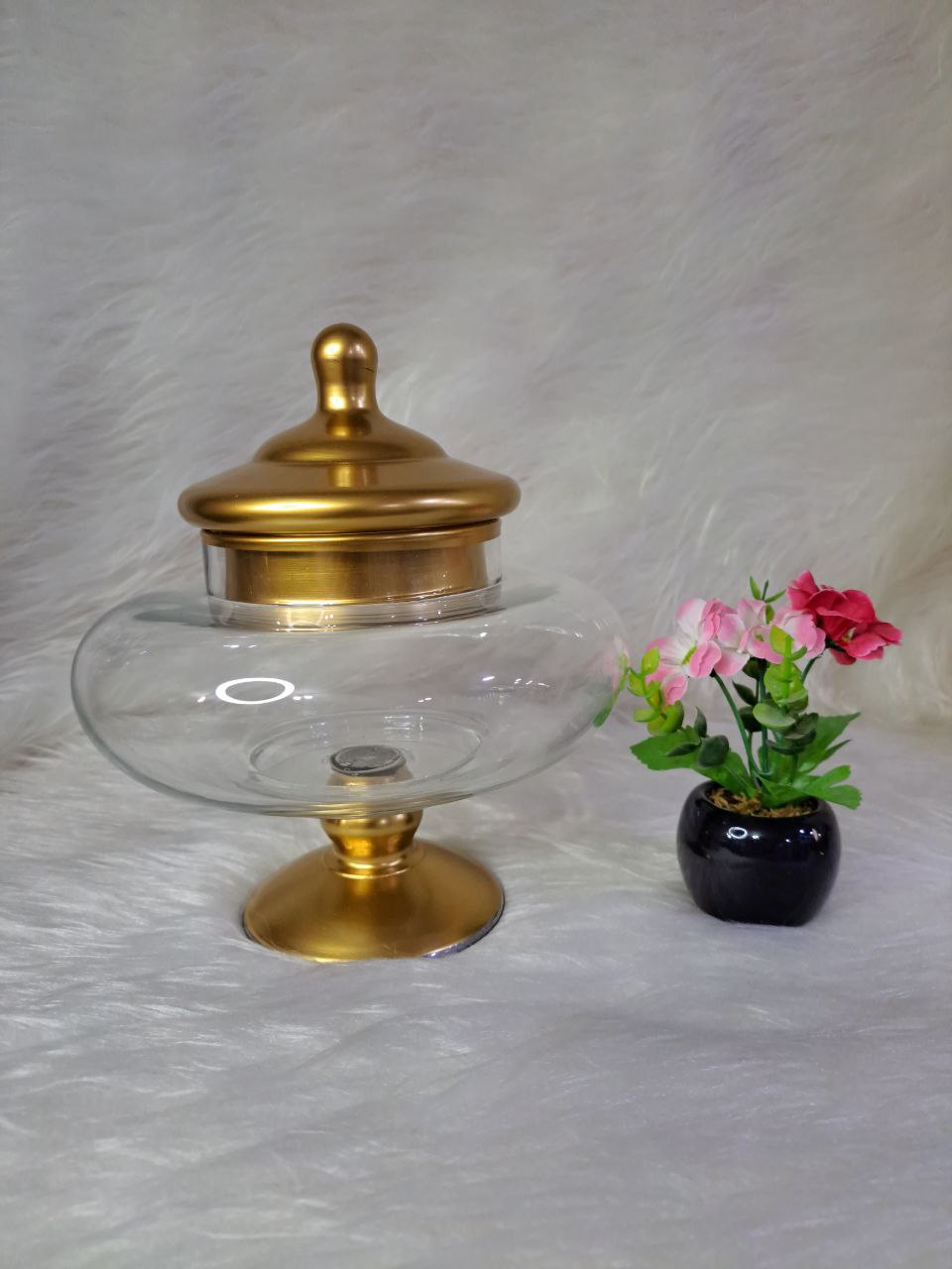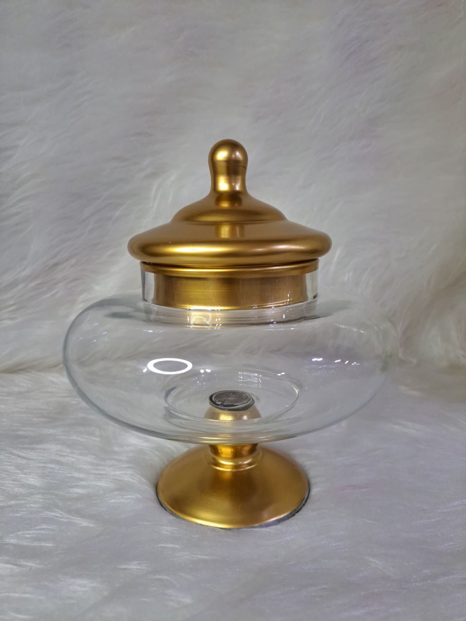 شکلات خوری مدل دورنگ طلایی با کد ۱۵۰۰۸ یک محصول زیبا و شیک جهت پذیرایی از مهمانان شما می باشد. ارتفاع این شکلات خوری 23 سانتی متر و پهنای کف پایه 10 سانتی متر و قطر درب آن 12.5 سانتی متر می باشد. جنس بدنه این محصول از شیشه و قسمت اتصال بالا و پایین از جنس آنتیک می باشد.