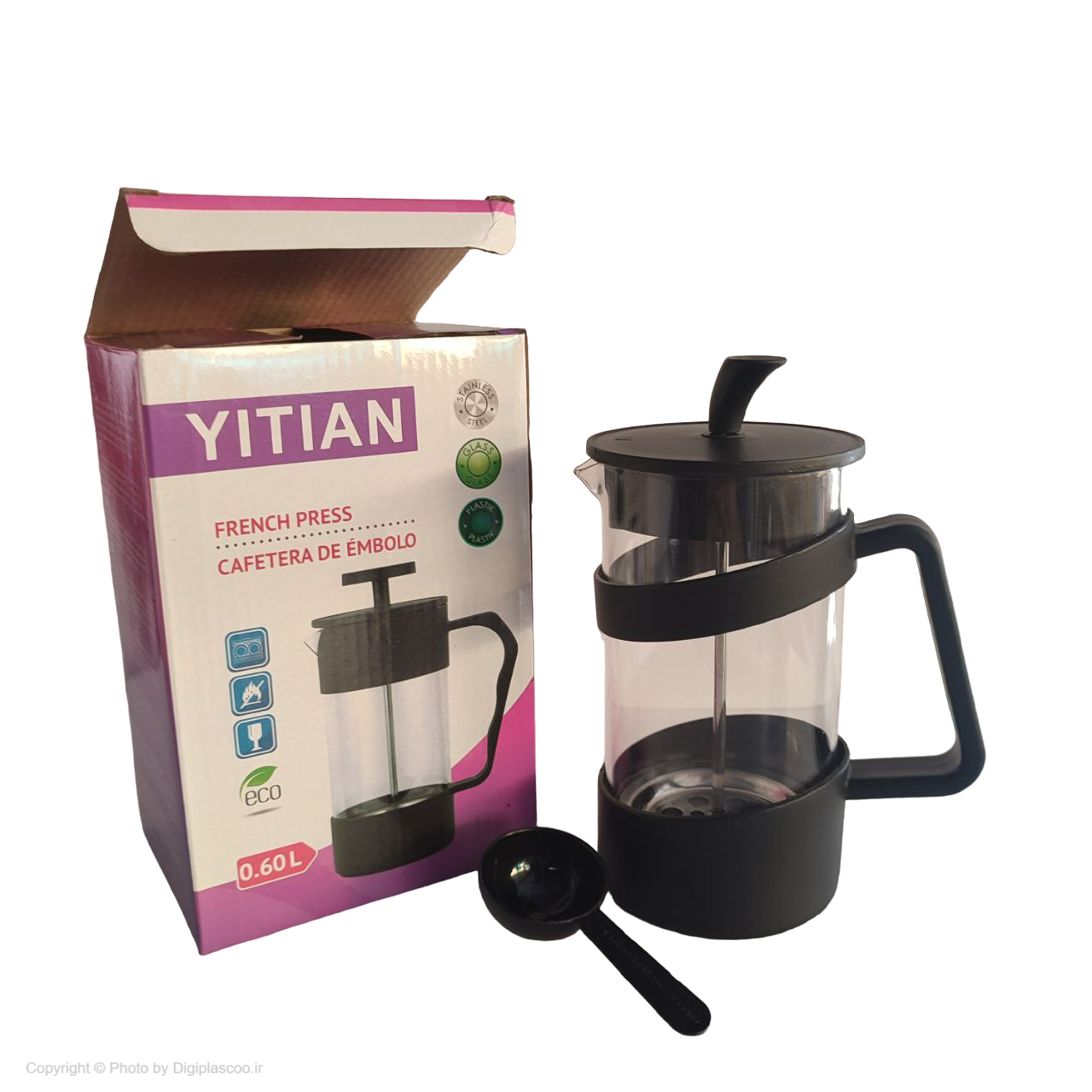 فرنچ پرس 600 میلی لیتر YITIAN بدنه پلاستیک پلی پروپیلن و جنس مخزن شیشه ای دارای فیلتر داخلی وسیله ای بسیار ساده و کاربردی است که با استفاده ازآن می توانید چای، دمنوش، قهوه و البته کف شیر درست کنید. ظرفیت این دستگاه 600 میلی لیتر است. فرنچ پرس از یک مخزن، صافی، اهرم و درب تشکیل شده است که درب، صافی و اهرم به هم متصل هستند و برای جداسازی مواد از قهوه و یا دمنوش استفاده میشوند. استفاده از فرنچ پرس و قهوه ساز بسیار آسان است و درهرمکانی میتوانید از آن استفاده کنید چون نیاز به برق و یا وسایل اضافی مثل فیلتر و سایر موارد نیست. همین طور میتوانید این وسیله را در مسافرت همراه خود ببرید.فرنچ پرس ها در سایز ها و مدل های مختلف به فروش میرسند، فرنچ پرس معمولا دارای مخزن شفاف که از جنس پیرکس هستند و درسایزهای 2 نفره تا بسیار بزرگ در بازار موجود هستند. در هنگام تهیه فرنچ پرس و قهوه ساز سعی کنید از جنس پیرکس و اهرم استیل مرغوب تهیه کنید و دقت داشته باشید صافی تمام قطر مخزن را بپوشاند.