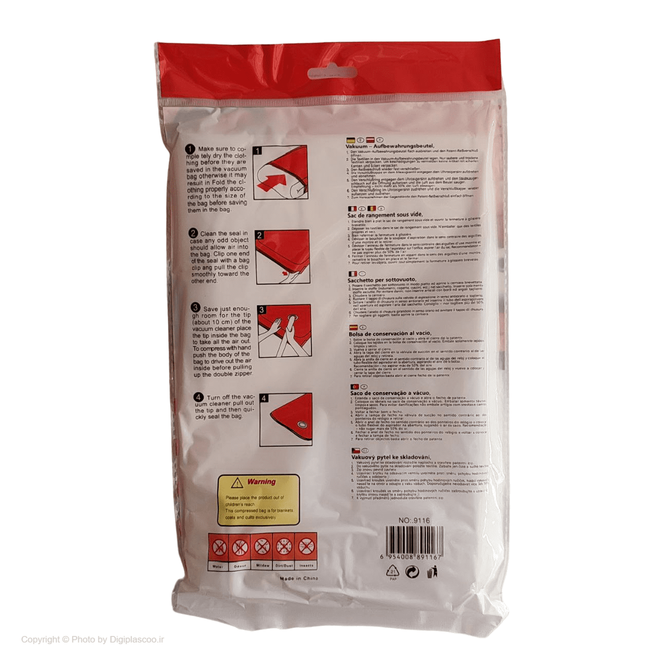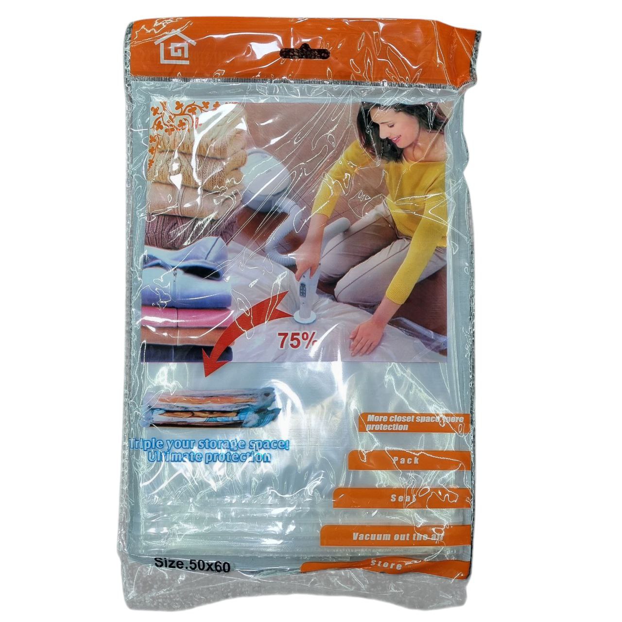 وکیوم پک کیسه مخصوصی است که شما میتوانید با استفاده از آن حجم البسه خود را تا 75% کاهش دهید. یکی از کاربردهای استفاده از کیسه کم حجم کننده لباس یا همان وکیوم بگ جلوگیری از نفوذ حشرات، بید زدگی، رطوبت، بوگرفتگی، گرد و خاک و نفوذ قارچ ها و باکتری ها به داخل البسه است. یا تصور کنید که قصد رفتن به سفر را دارید آیا دوست ندارید حجم لباس هایتان تا یک چهارم کاهش پیدا کند تا راحت تر در چمدان یا ساک شما جای بگیرد؟ کیسه کم حجم کننده لباس (وکیوم بگ) این کار را برای شما انجام می دهد. فقط کافیست از قسمت کناری کیسه پوشاک خود را وارد کیسه کرده و سپس بعد از بستن زیپ مخصوص با جاروبرقی اقدام به تخلیه هوای داخل کیسه نمایید. دقت کنید برای دریافت نتیجه مطلوب از تا کردن زیاد البسه داخل کیسه خودداری نمایید تا هوا بتواند در هنگام مکش به درستی خارج شود همچنین از فشردن زیاد البسه داخل یک کیسه خودداری نمایید. در هنگام تخلیه هوا حتما ابتدا جاروبرقی را خاموش کرده و سپس خرطومی جاروبرقی را از دهانه کیسه جدا کنید تا آسیبی به درب خروجی هوا وارد نشود.