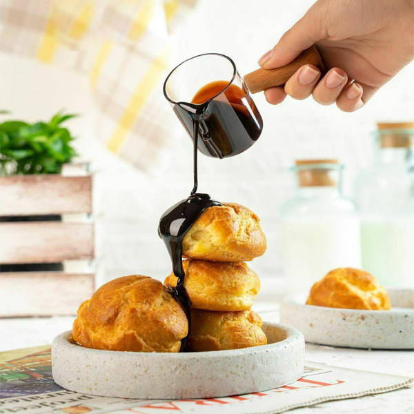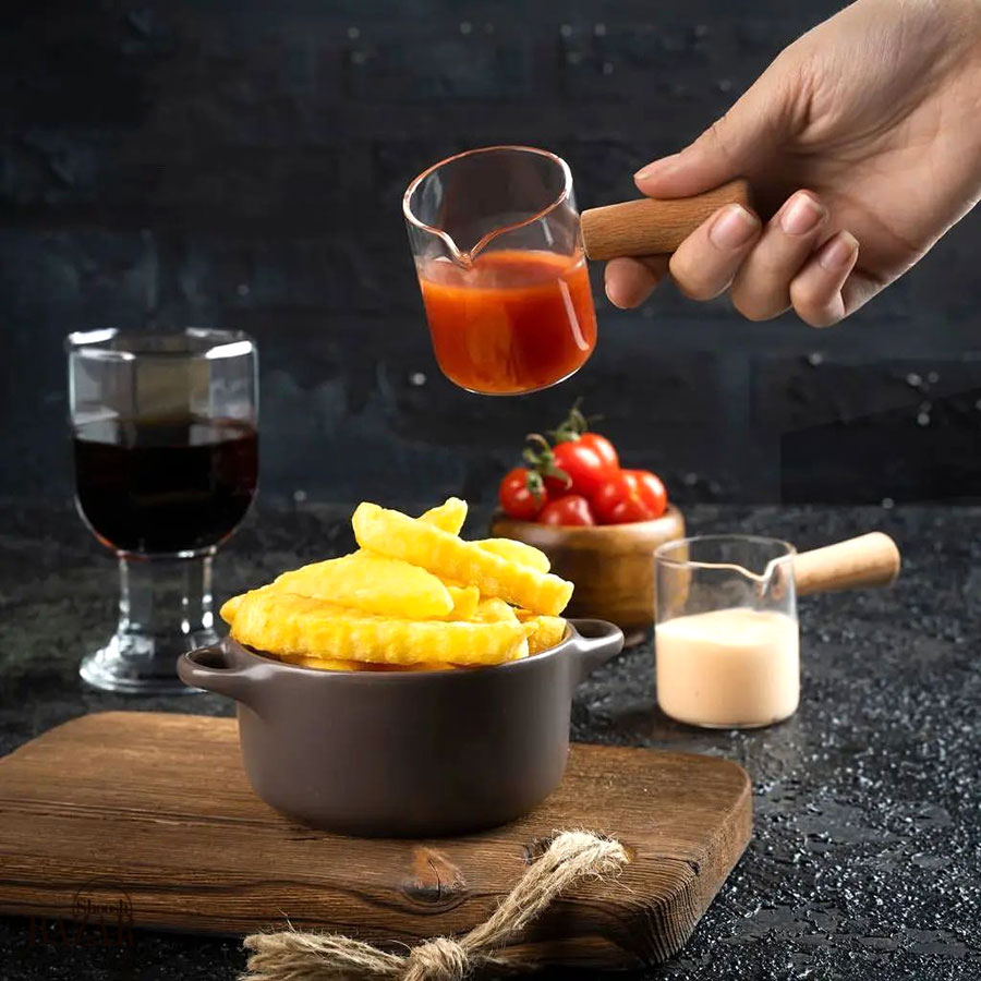 این ظرف سس خوری در مدل فانتزی با بدنهای از جنس پیرکس به همراه دسته چوبی تولید و در دسته بندی ظروف سرو و پذیرایی به بازار عرضه گردیده است. پیرکس به کار برده شده در تولید این ظرف سس خوری، شفاف و بدون حباب بوده و به مرور زمان و بر اثر استفادههای مکرر مات و کدر نخواهد شد. این سس خوریها از سری ظروف سرو و پذیرایی پراستفاده در میهمانیها میباشند.