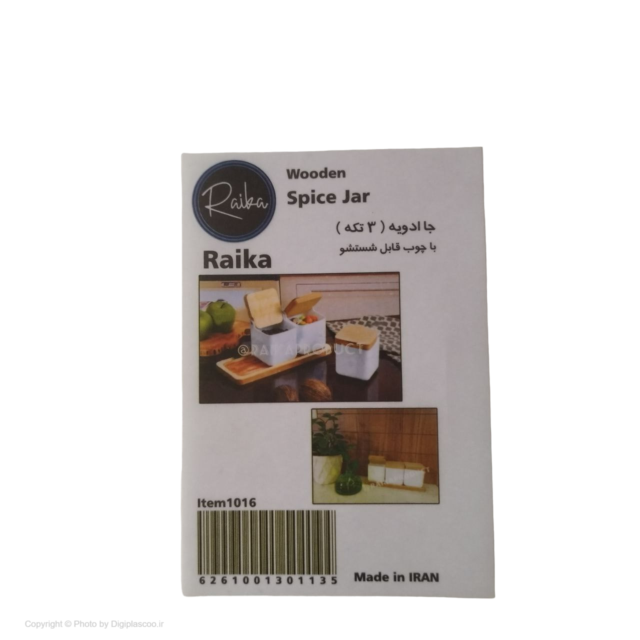 جا ادویه سه تایی رایکا متشکل از سه ظرف پلاستیکی مشکی و سفید با درب چوبی به همراه یک سینی چوبی میباشد و جزء لوازم ضروری در آشپزخانه است. این جا ادویهای به عنوان یک ظرف نگهدارنده ادویه جات، از زیبایی چشم نوازی برخوردار است. طعم و مزه غذا برای اکثر بانوان از اهمیت ویژهای برخوردار است. برای این امر استفاده از ادویهجات بسیار موثر خواهد بود.