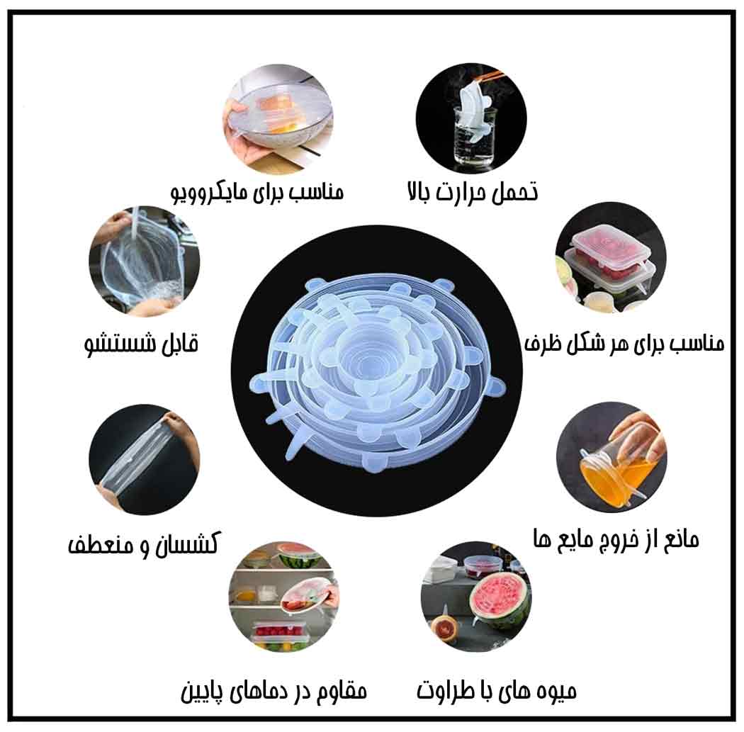 درپوش محافظ غذا از جنس رپوشهای سیلیکونی با مقاوت حرارتی و قابلیت انعطاف پذیری فوق العاده در 6 سایز متفاوت، تقریبا تمام ظروف آشپزخانه شما را پوشش میدهند. این محصول بر روی انواع ظروف با شکلهای مختلف به راحتی قرار گرفته و از تبادل هوای میان محیط و محتویات ظرف جلوگیری میکند تا طراوت و تازگی غذا، سالاد، سبزیجات، میوهها و … حفظ شود. همچنین قابل استفاده در فریزر و مایکروویو است. این محصول قابل شستشو است و می توان آن را در ماشین لباسشویی و ظرفشویی شست.