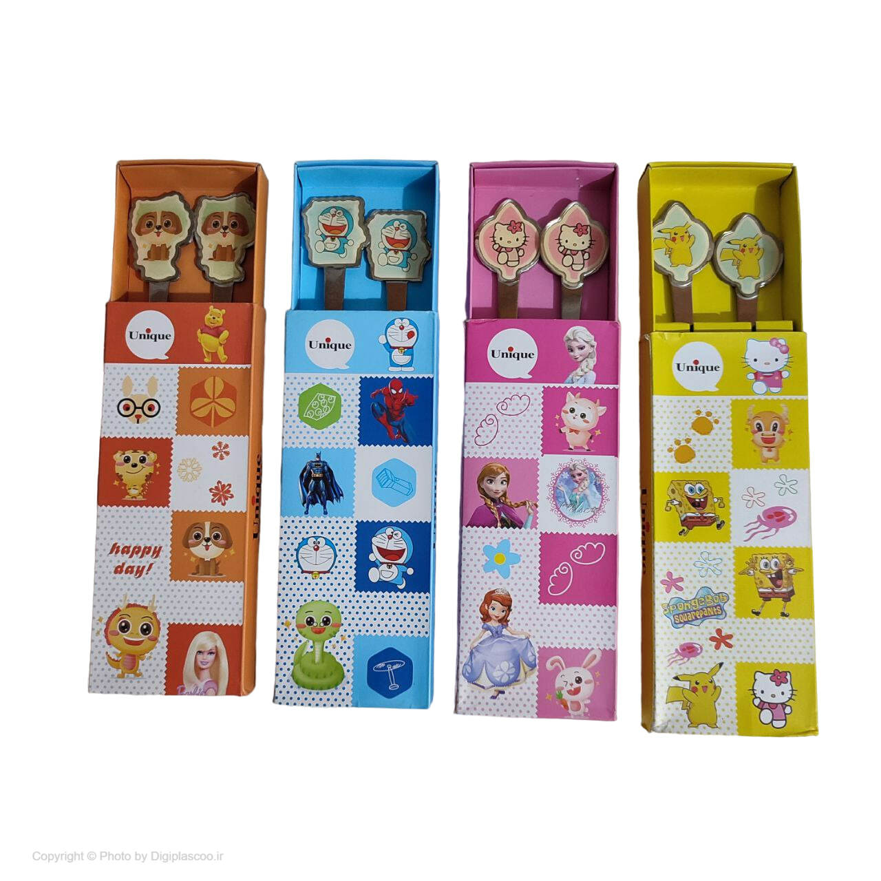 یکی از عمدهترین مشکلات در بین والدین، غذا دادن به فرزندان است. معمولا کودکان به دلیل انرژی زیاد و علاقه به شیطنت و بازی، تمایلی به خوردن غذا در کنار سایر اعضای خانواده در اوقات مشخص نخواهند داشت. یکی از راه های کارآمد برای تشویق کودکان به خوردن غذا، استفاده از لوازم فانتزی با طرح های زیبا است. این کار به شما کمک میکند تا راحتتر فرزندتان را مجذوب غذا خوردن کنید. ست قاشق و چنگال کودک یونیک یکی از محصولات فانتزی کودک میباشد. این سرویس قاشق و چنگال جذاب، از لوازم محبوب کودک دلبند شما خواهد شد. قسمت انتهای دسته قاشق و چنگال یونیک با استیکر شخصیتهای کارتونی، تزئین شده است. ابعاد این استیکرهای فانتزی به گونهای میباشد که کودک شما به راحتی قادر به در دست گرفتن آنها است. همچنین اندازه قاشق و چنگال هم کاملا مناسب برای کودکان است.