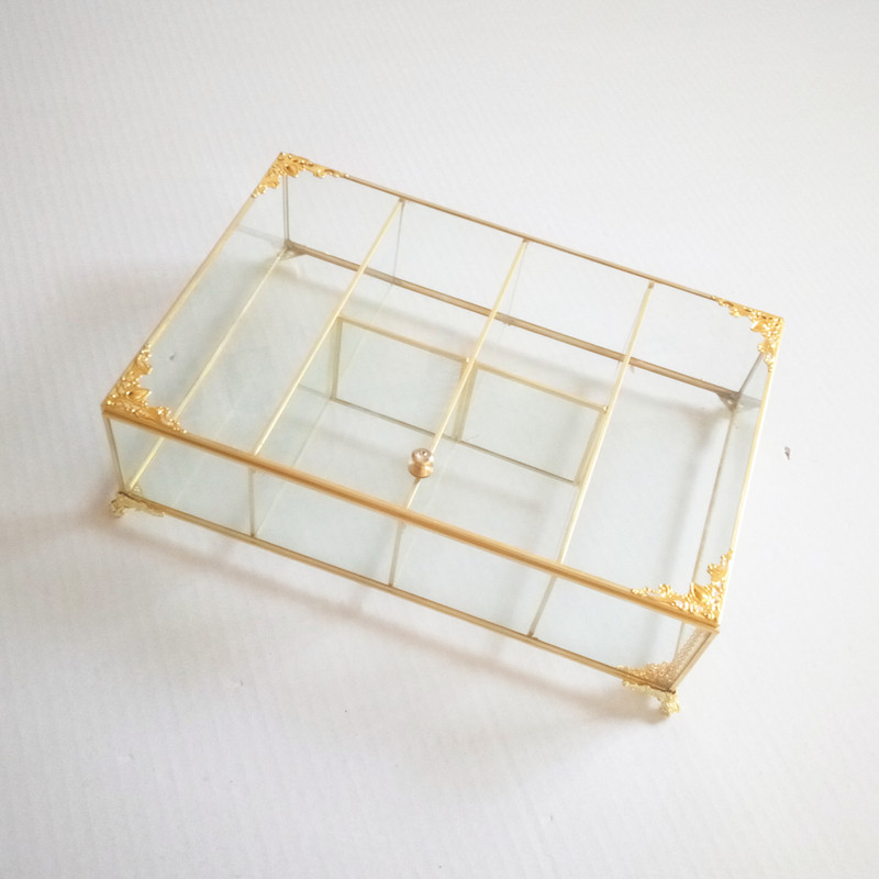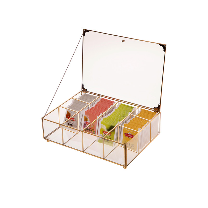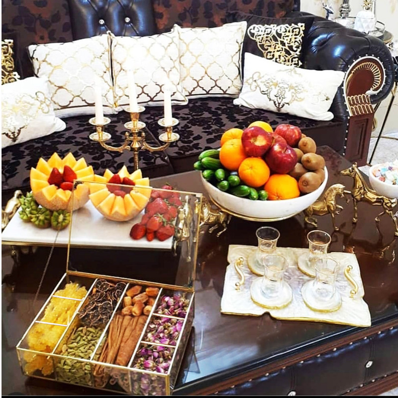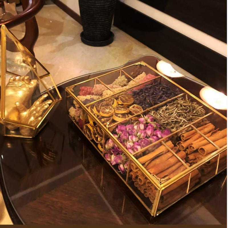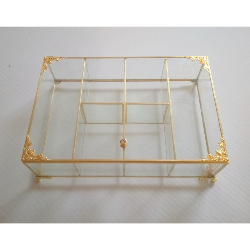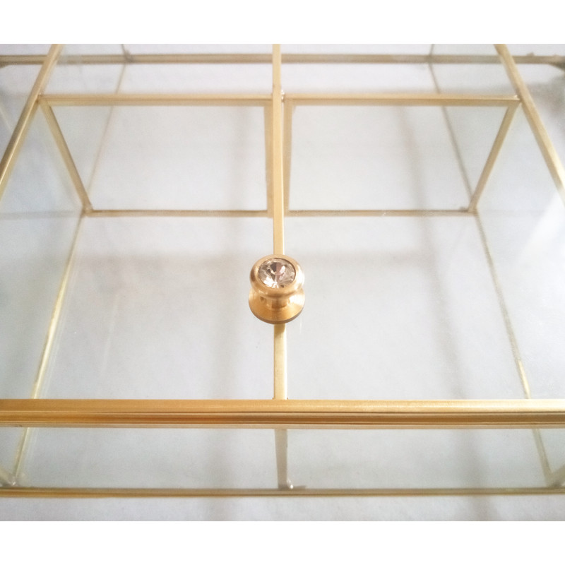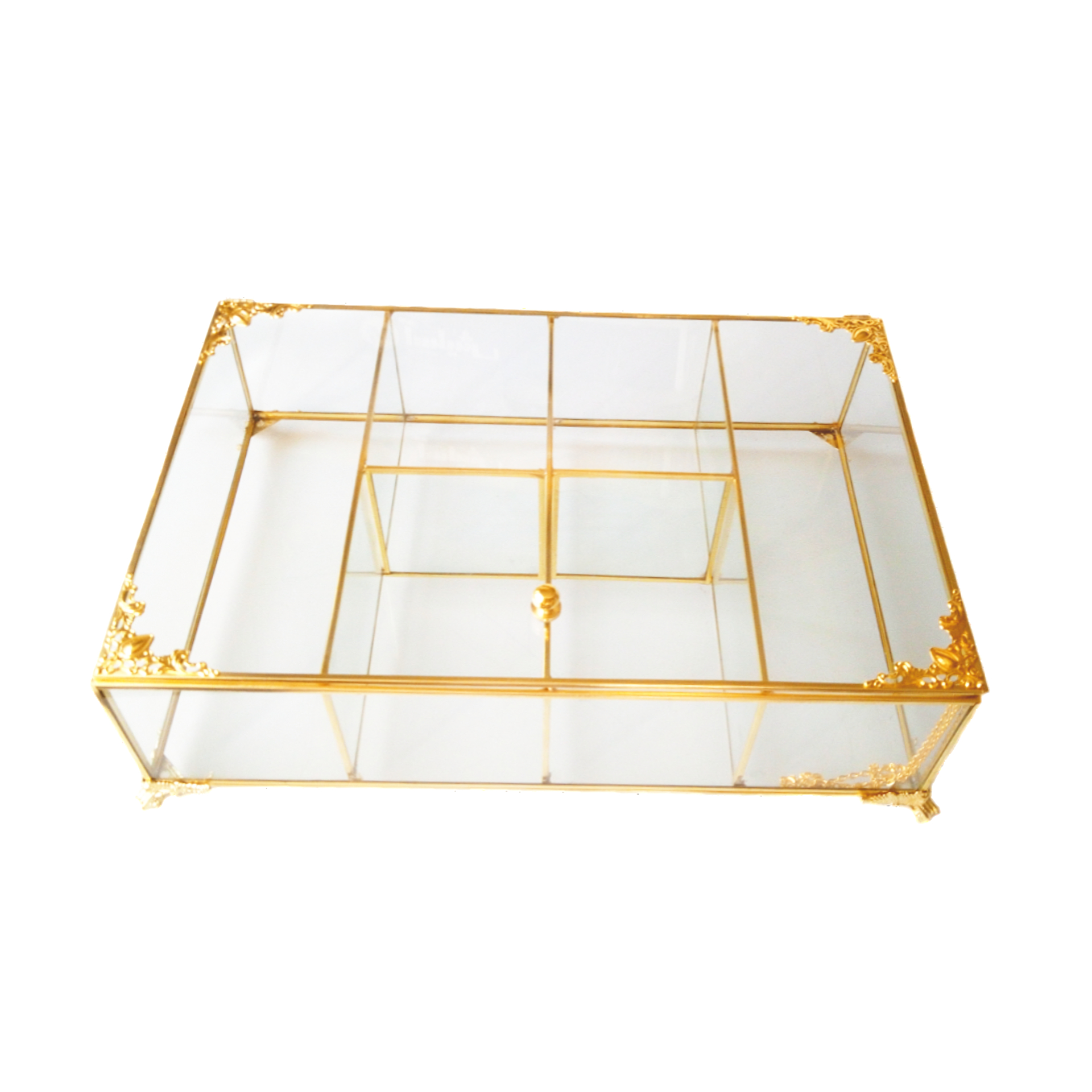 جعبه پذیرایی شیشهای ساخته شده از نوارهای برنجی و شیشه به ضخامت 2 میلیمتر که برای پذیرایی انواع تنقلات و آجیل و شکلات و همچینین برای نگهداری وسایل تزینی و لوکس مناسب میباشد و به محیط خانه و پذیرایی شما نمایی لوکس و جذاب میبخشد که باعث دلنشینی بیشتر در پذیرایی میشود.