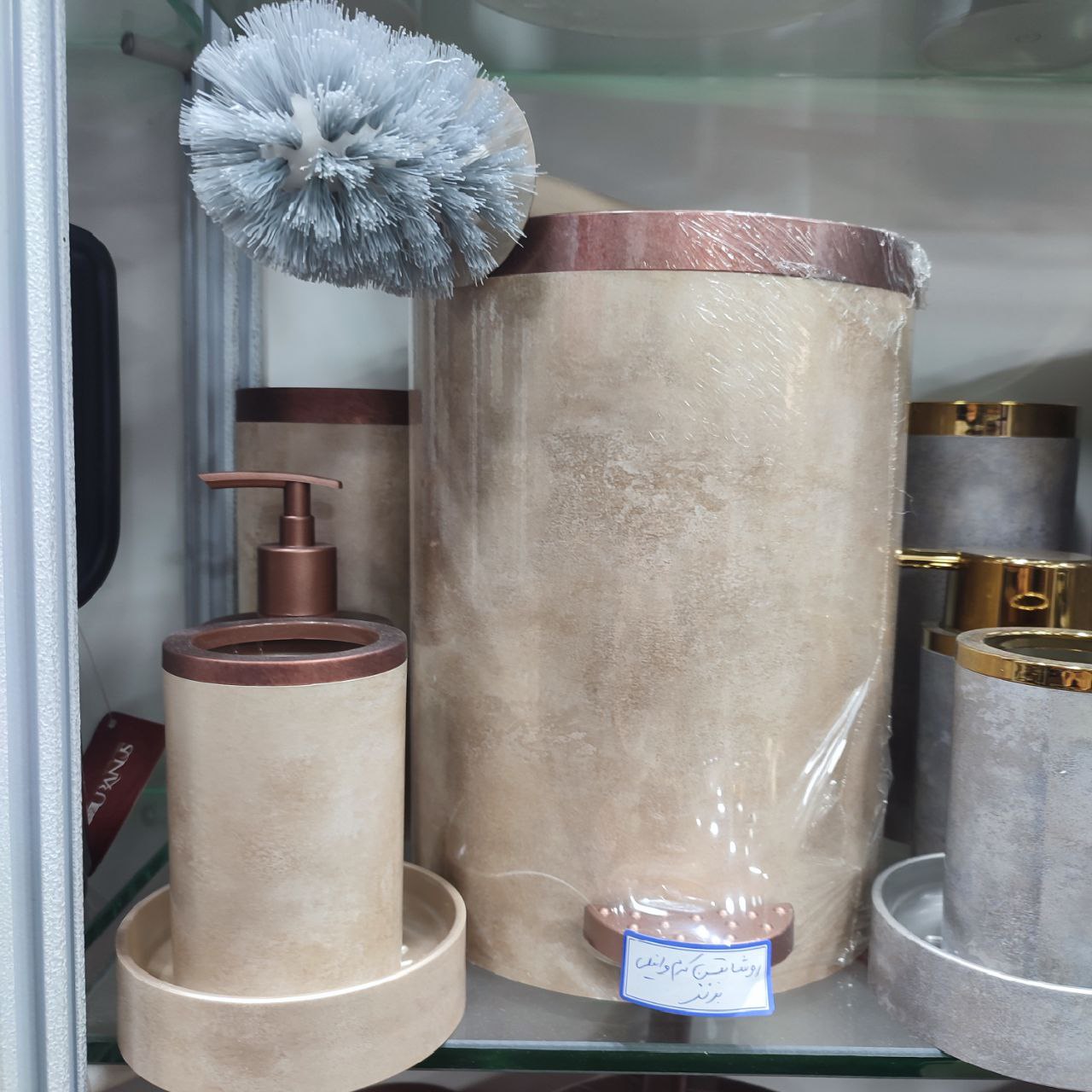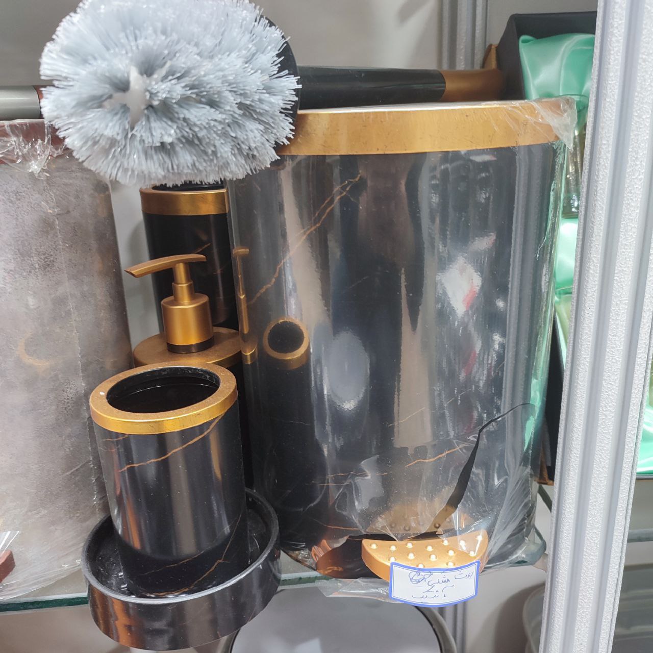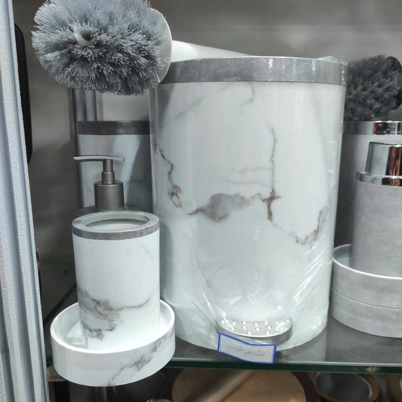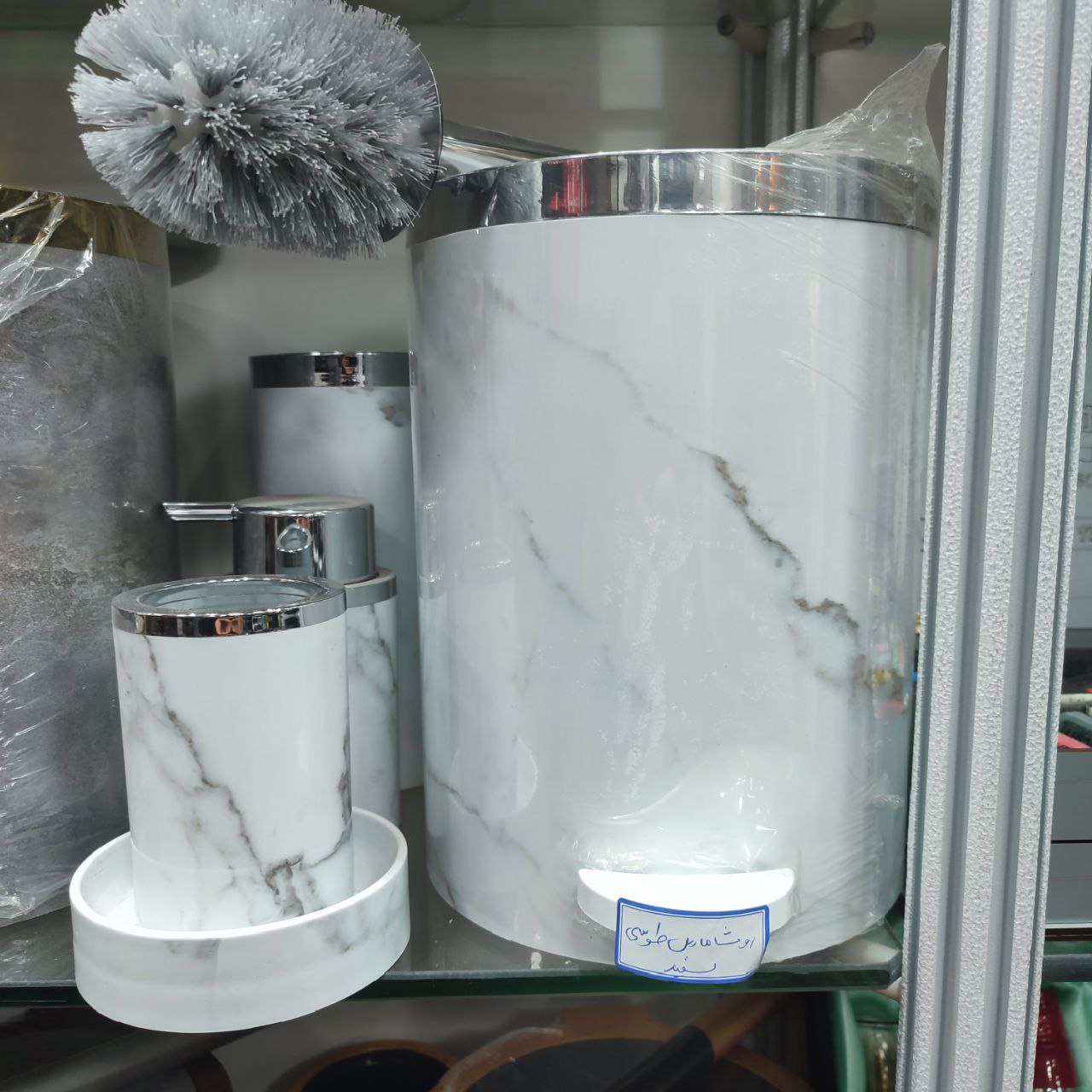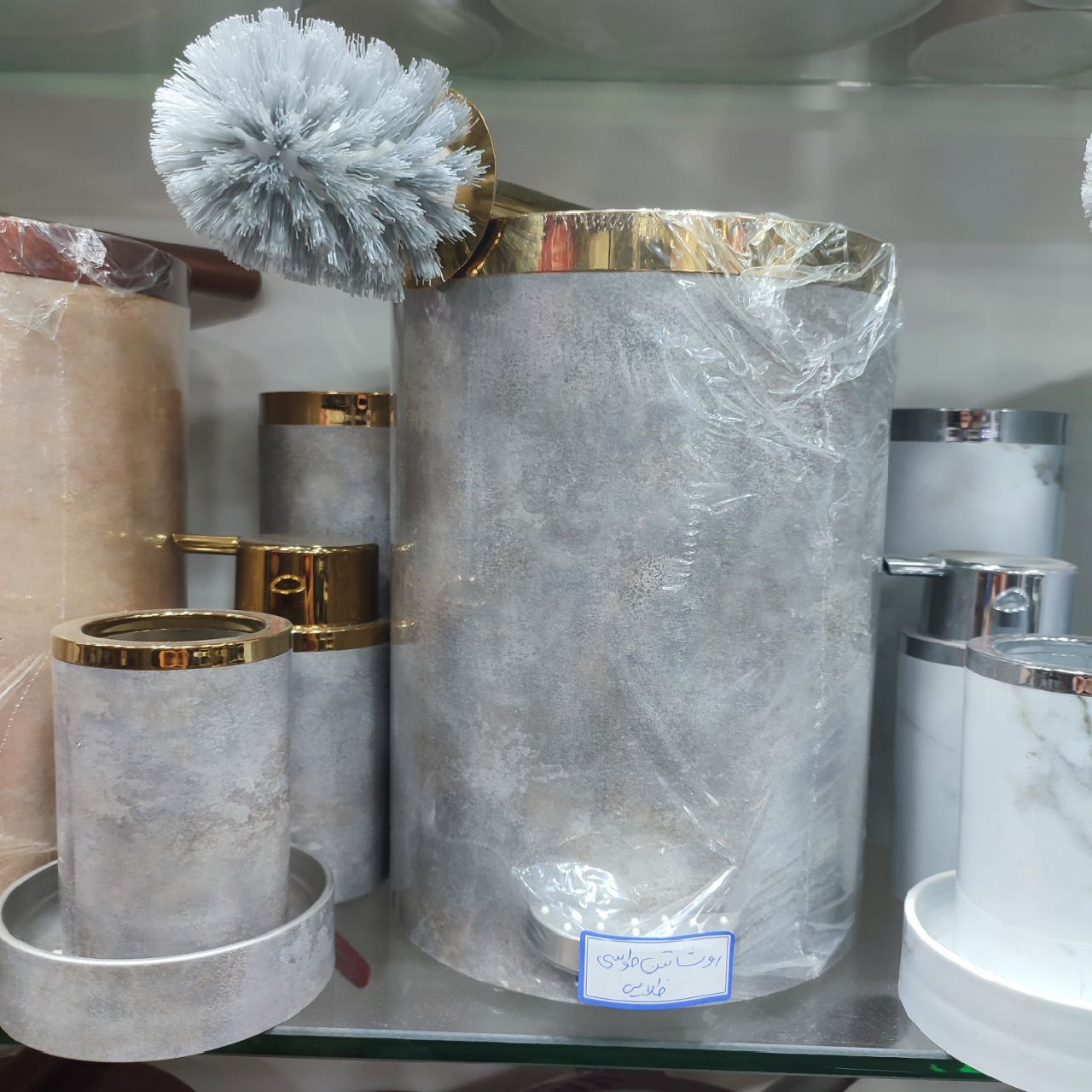 شامل سطل زباله ،جای مایع دستشویی، برس توالت شوی، جای صابون جامد و لیوان