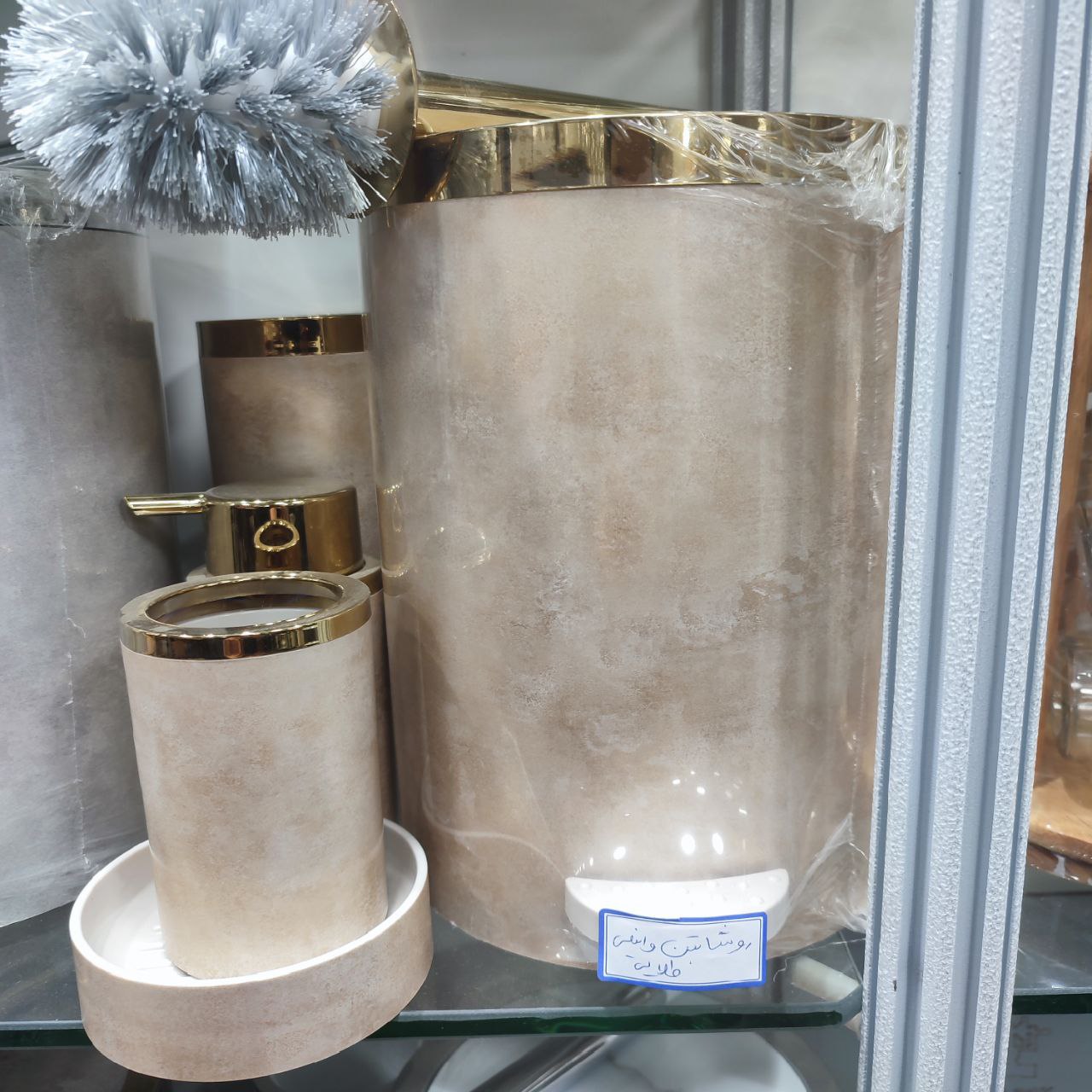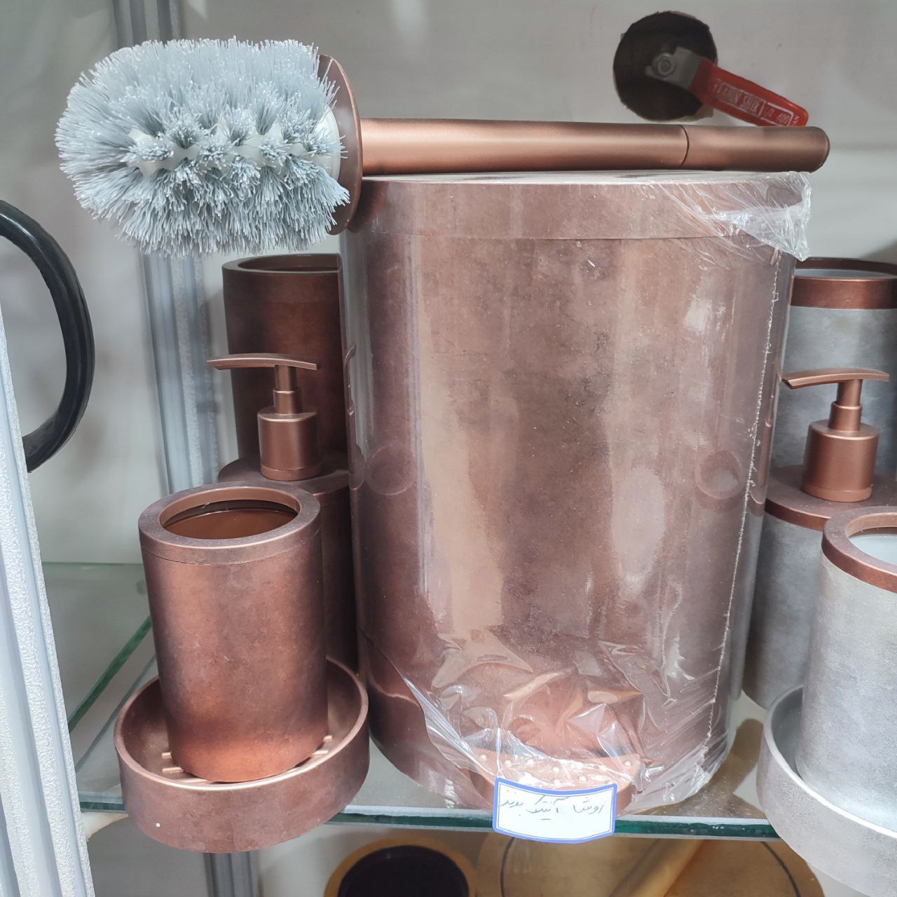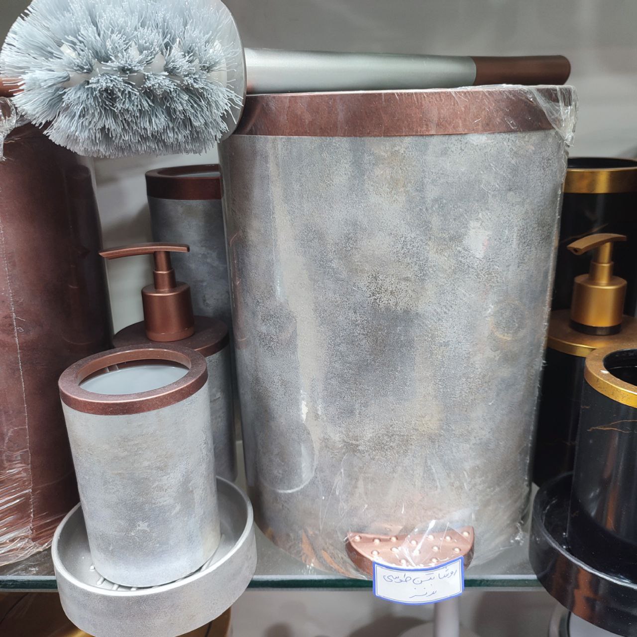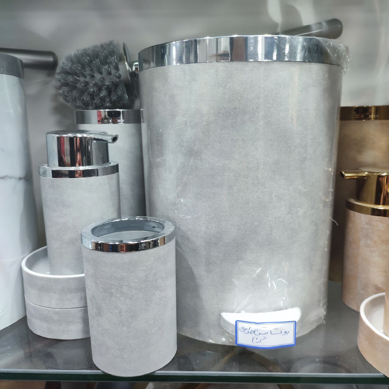 شامل سطل زباله ،جای مایع دستشویی، برس توالت شوی، جای صابون جامد و لیوان