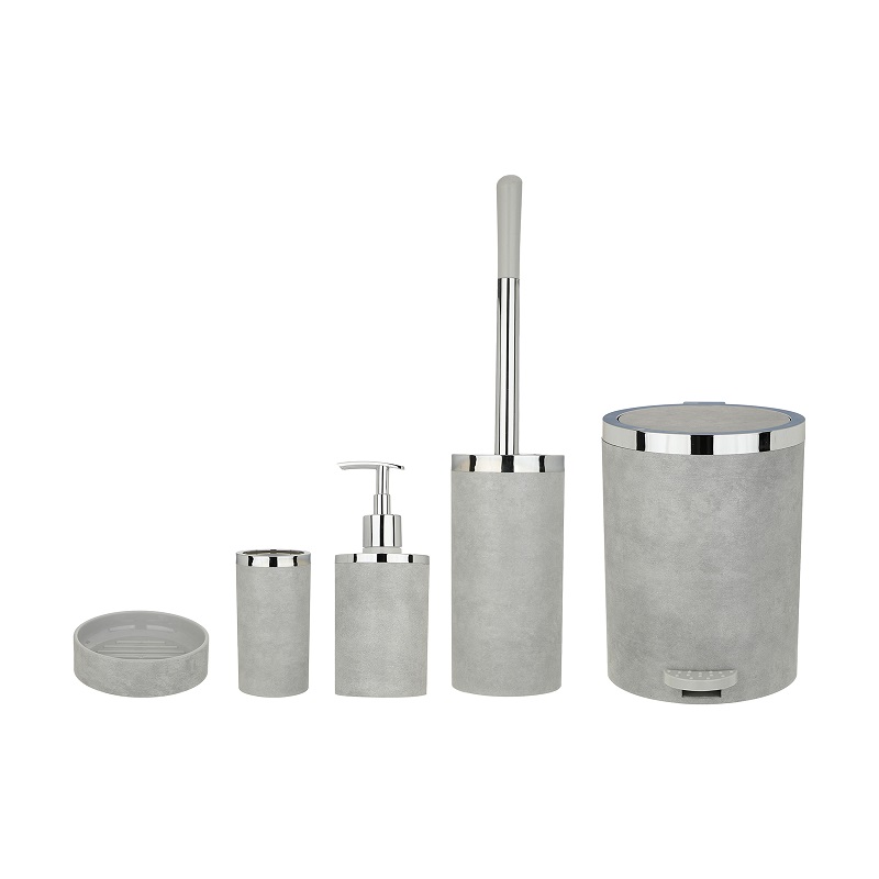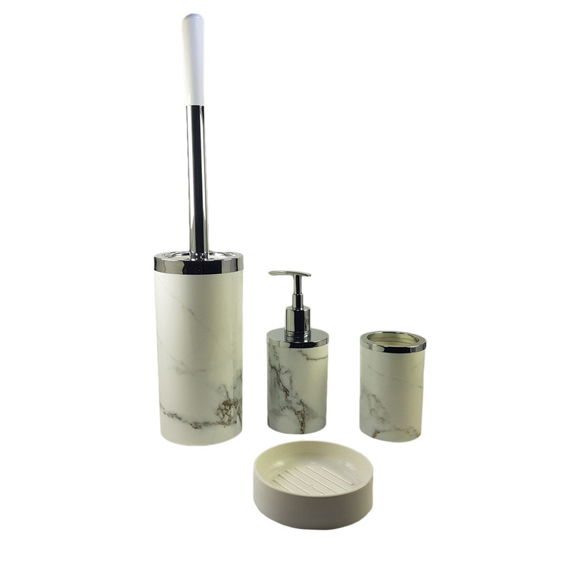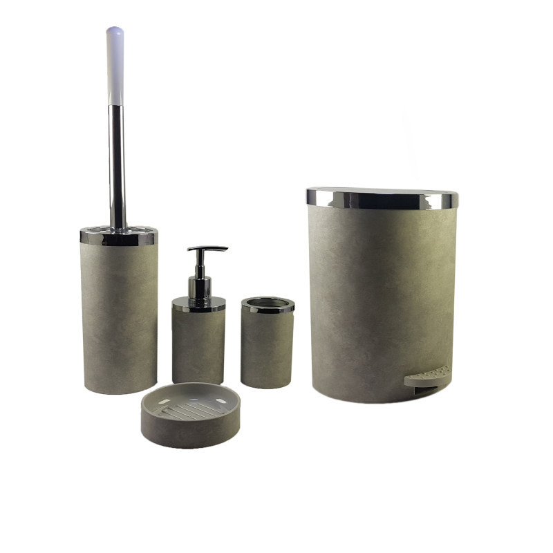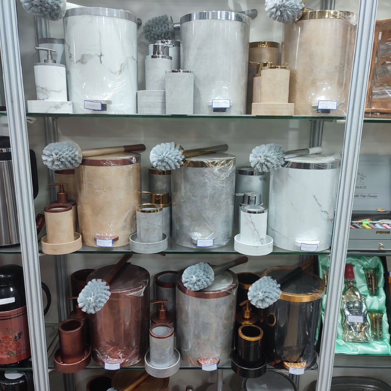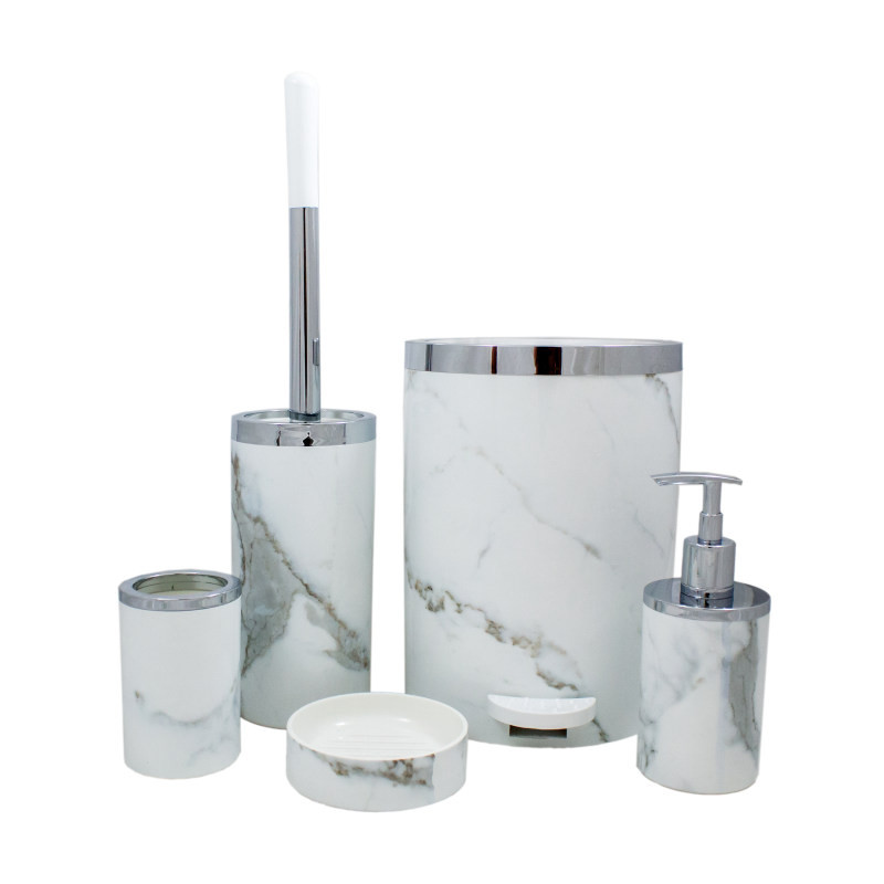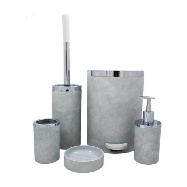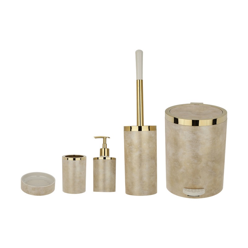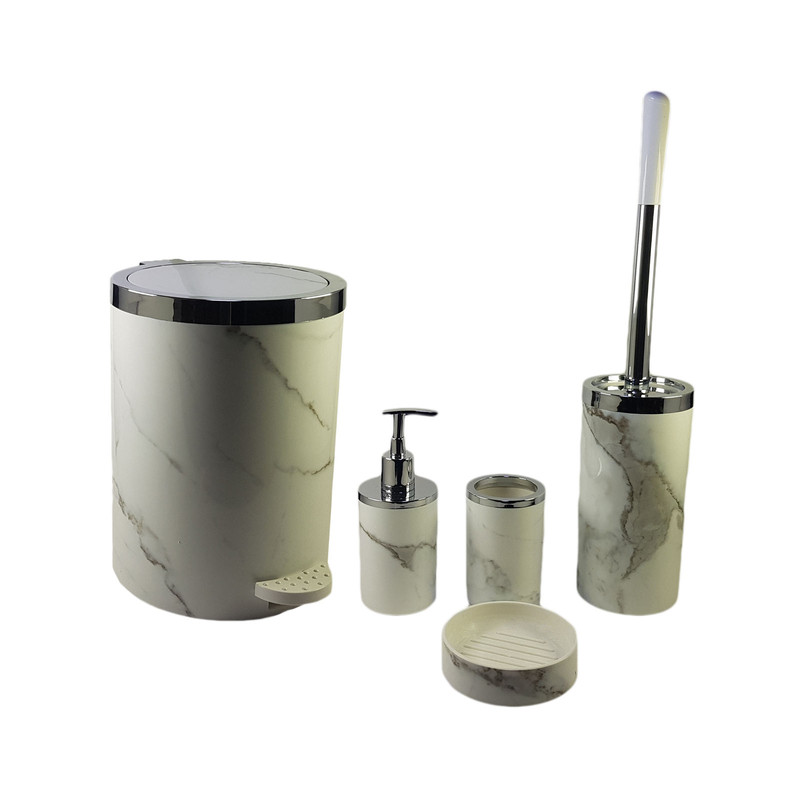 شامل سطل زباله ،جای مایع دستشویی، برس توالت شوی، جای صابون جامد و لیوان