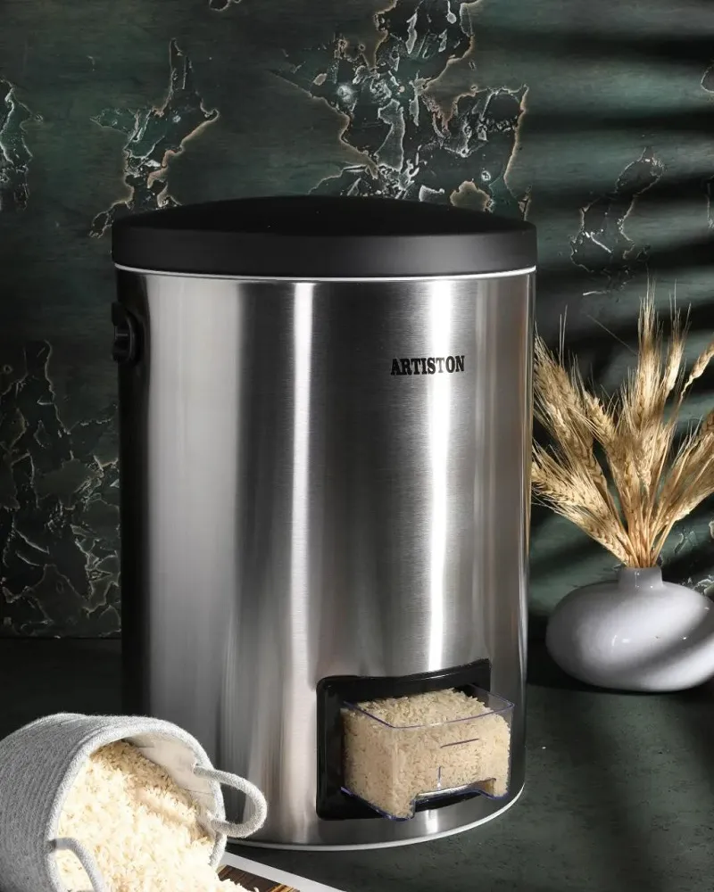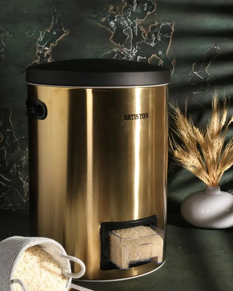 یکی از ظروف پرکاربرد آشپزخانه سطل برنج است. از آنجایی که برنج جزو مواد غذایی پرمصرف ایرانیهاست، وجود سطلهای برنج ضروری به نظر میرسد. چرا که میشود در هر لحظه از میزان موجودی برنج اطلاع پیدا کرد. از طرفی هم چون این ظروف دردار هستند، آلودگی هم به برنج منتقل نمیشود. یکی از محصولات آرتیستون است که برای نگهداری از برنج طراحی شده است. بدنهی سطل از جنس استیل است و به همین دلیل کیفیت بالایی دارد. مهمترین قسمتش پیمانه پلاستیکی آن است؛ این پیمانه در جلوی سطل تعبیه شده و برای هر بار فقط کافی است پیمانه را به پدال پشتی فشار داده و از آن استفاده کنید. هرزمان هم که برنج داخل سطل خالی شد میتوانید از بالا دوباره آن را پر کنید. گنجایش سطل هم چیزی در حدود 10 کیلو برنج است.