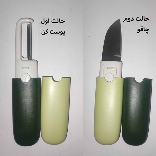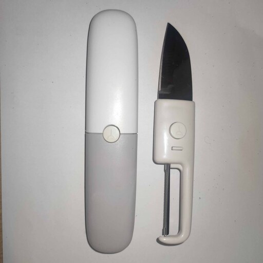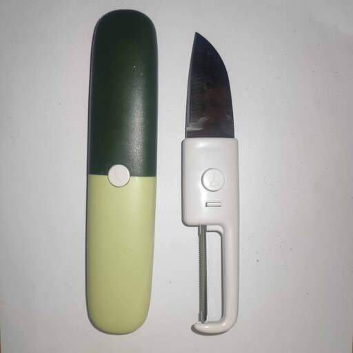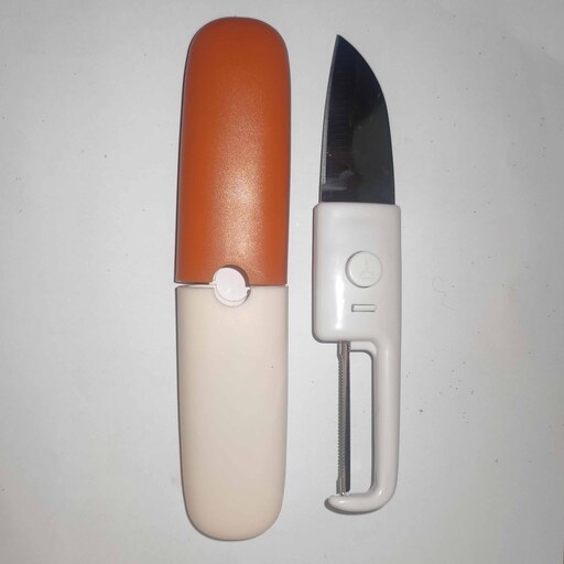 این ابزار چندکاره شامل یک چاقو و یک پوستکن است. جنس تیغهها استیل ضد زنگ و بدنه پلاستیکی است. با استفاده از دو دکمه روی بدنه میتوانید پوشش پلاستیکی روی چاقو یا پوست کن را خارج کنید و از طرف دیگر به عنوان دسته استفاده نمایید. همچنین می توانید دو غلاف پلاستیکی را همزمان نیز در بیاورید. وجود پوشش پلاستیکی باعث میشود بتوانید چاقوی چند کاره سفری را به راحتی در کیف، جیب، کیسه پلاستیکی و ... حمل کنید.