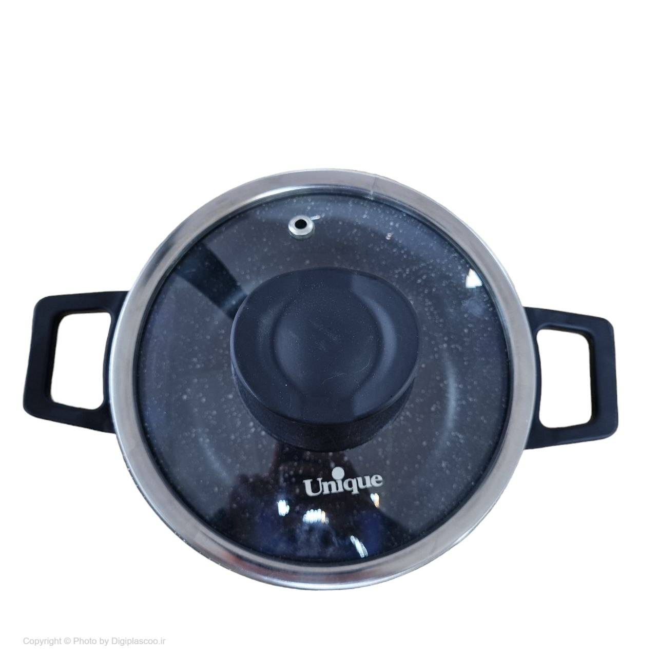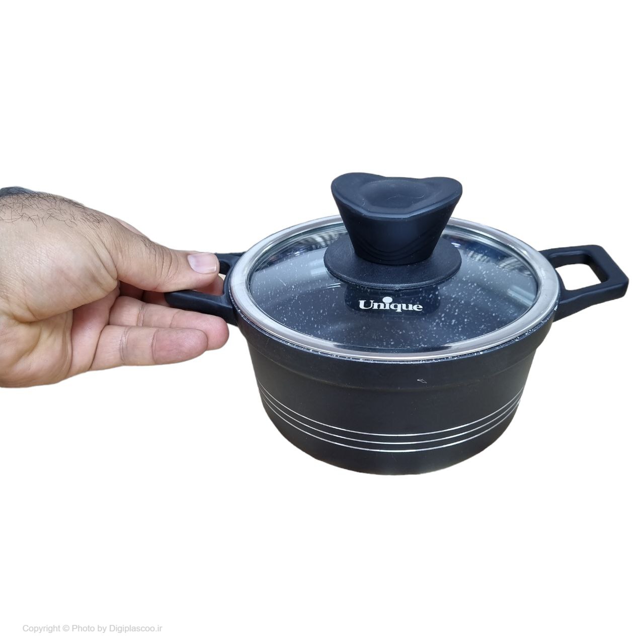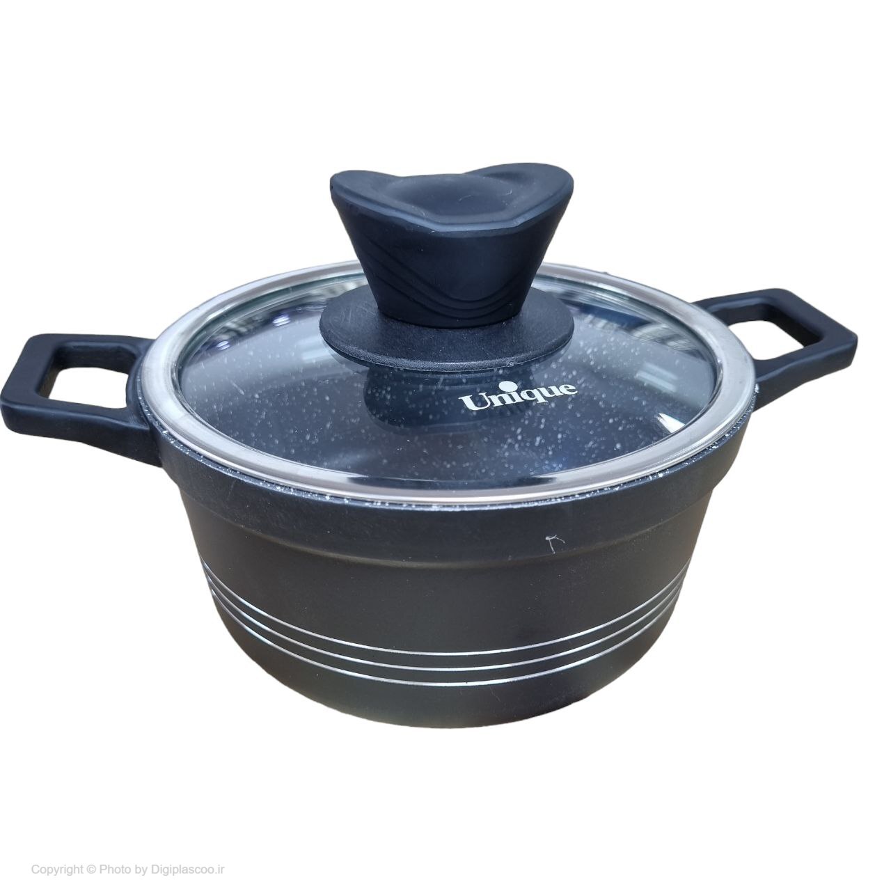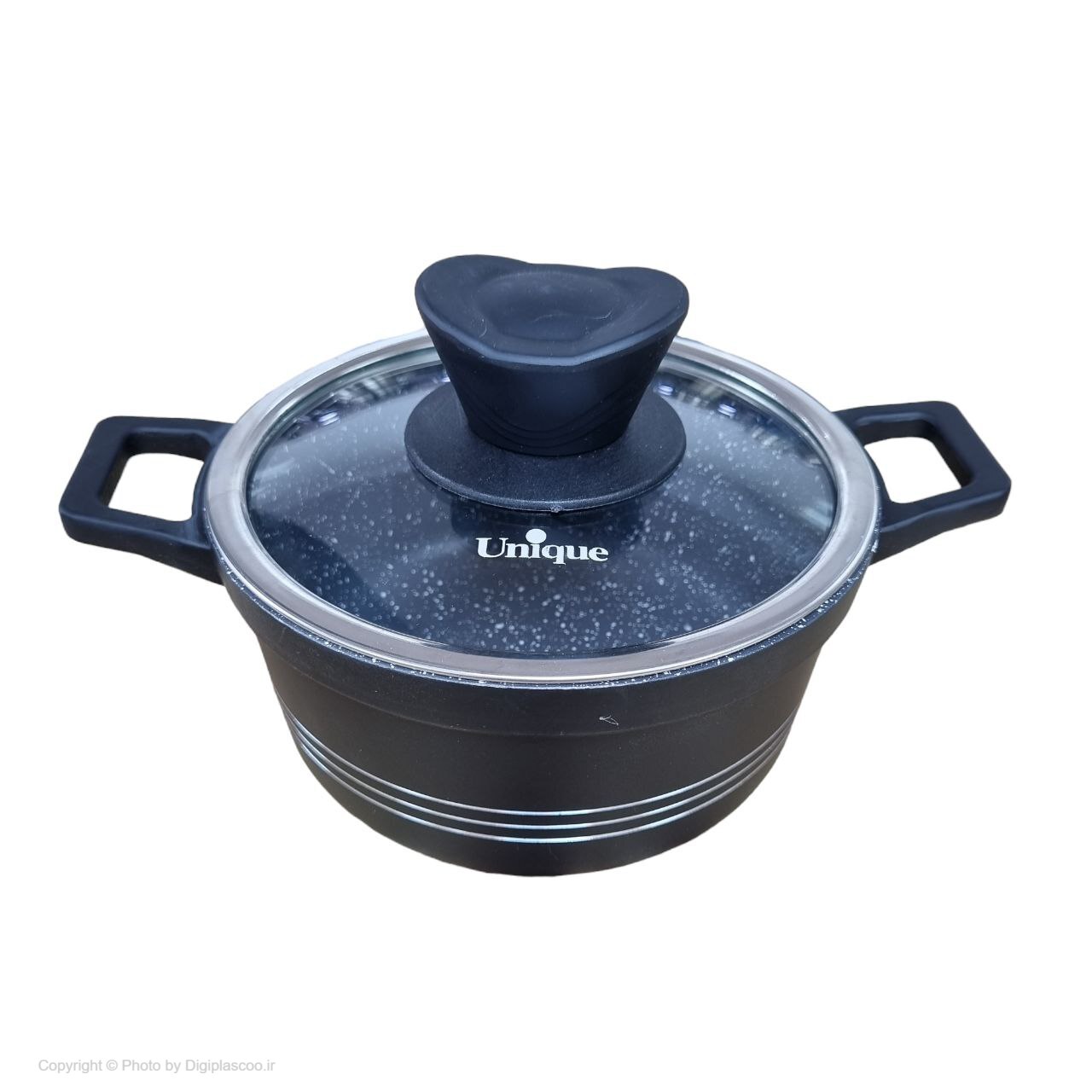 بدون شک قابلمهها از ملزومات هر آشپزخانهای هستند. قابلمه کف گرانیت سایز 16 یونیک کد 7801 یک قابلمه تک به قطر 16 سانتی متر است. این قابلمه چدنی با روکش گرانیتی است و در کف آن از یک لایه مخصوص برای پخش حرارت استفاده شده است.این قابلمه دارای یک درب پیرکس دور استیل به همراه درب دستگیره پلاستیکی و روزنهای برای خروج بخار از قابلمه است. دستههای این قابلمه از جنس بدنه و متصل به آن بوده که مقاومت بالایی دارند.