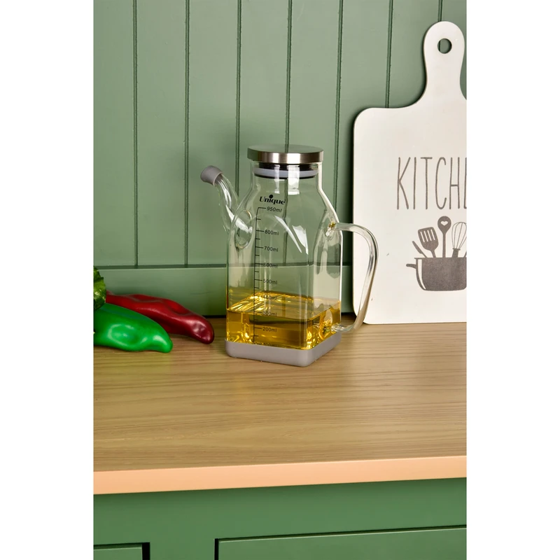 روغن ریز ها در آشپزخانه علاوه بر زیبایی و جلوه ای که با طراحی های خود به دکور آشپزخانه شما میدهند کارایی های دیگری نیز دارند که البته این کاراییها بسته به مدل آن ها متفاوت است روغن ریز های دارای درجه به ما کمک میکنند تا در زمانی که در آشپزی نیاز است که مقدار خاصی از روغن استفاده کنیم بتوانیم آن را بسنجیم. روغن ریز یونیک از جنس پیرکس و درب آن استیل میباشد و مناسب برای استفاده به عنوان روغن ریز، آبلیمو و سرکه و... است. حجم آن 950 میلی لیتر (0.95 لیتر) میباشد. روغن ریزها باید علاوه بر درب دارای درپوش قسمت خروجی نیز باشند تا از کثیف شدن روغن و در مجاورت هوا قرار گرفتن آن نیز جلوگیری کنند.